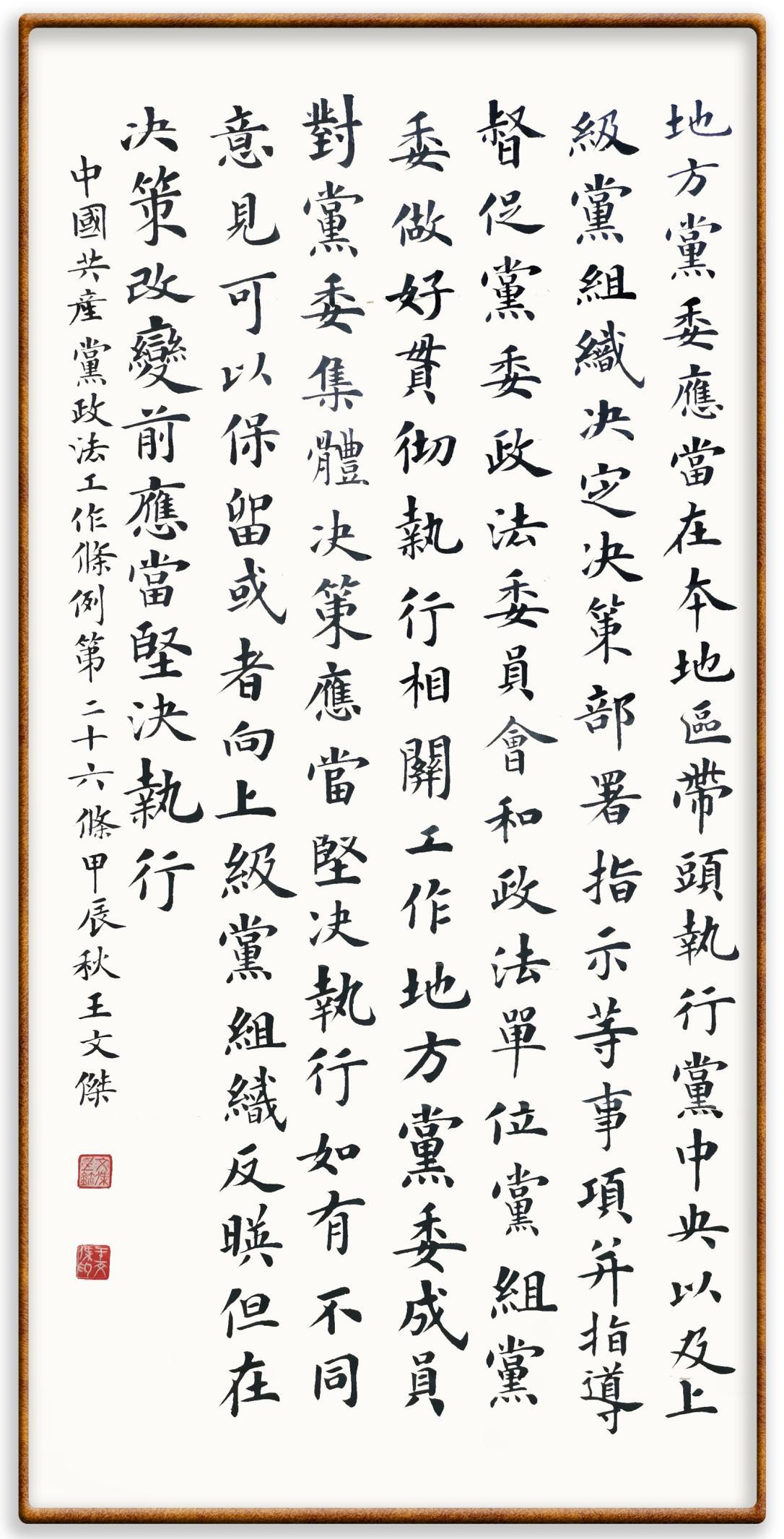 《中國共產(chǎn)黨政法工作條例》對黨領(lǐng)導(dǎo)新時代政法工作進行全面制度擘畫,為黨領(lǐng)導(dǎo)政法工作提供基本遵循,具有重大而深遠的意義。為學(xué)習(xí)好、宣傳好、貫徹好、實施好這部黨內(nèi)法規(guī),繼《中華人民共和國民法典》《中華人民共和國憲法》《信訪工作條例》《中華人民共和國澳門特別行政區(qū)基本法》《中華人民共和國香港特別行政區(qū)基本法》等法律法規(guī)之后,“書·法”系列活動將筆端對準《中國共產(chǎn)黨政法工作條例》。