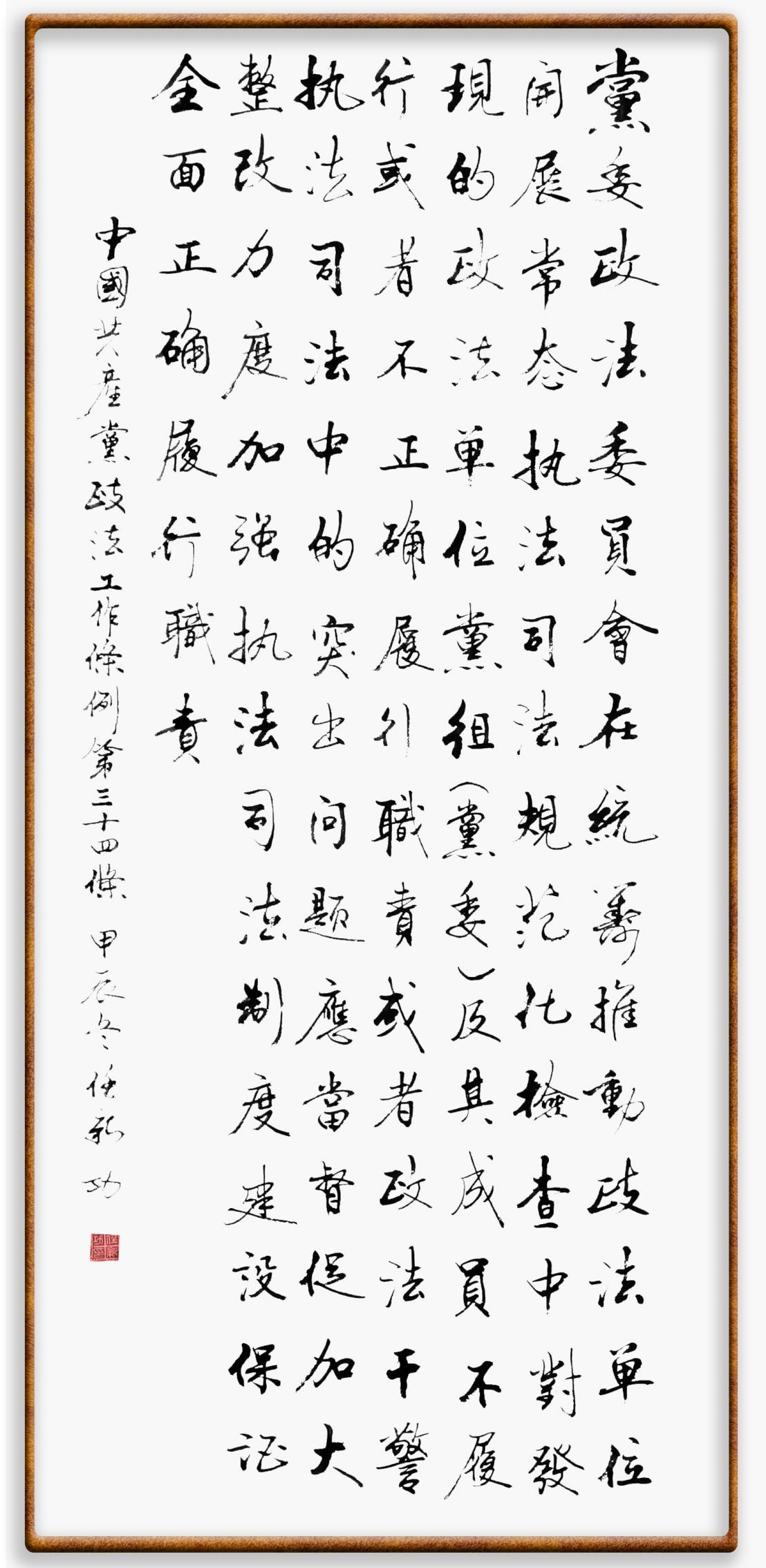 《中國(guó)共產(chǎn)黨政法工作條例》對(duì)黨領(lǐng)導(dǎo)新時(shí)代政法工作進(jìn)行全面制度擘畫(huà),為黨領(lǐng)導(dǎo)政法工作提供基本遵循,具有重大而深遠(yuǎn)的意義。為學(xué)習(xí)好、宣傳好、貫徹好、實(shí)施好這部黨內(nèi)法規(guī),繼《中華人民共和國(guó)民法典》《中華人民共和國(guó)憲法》《信訪工作條例》《中華人民共和國(guó)澳門特別行政區(qū)基本法》《中華人民共和國(guó)香港特別行政區(qū)基本法》等法律法規(guī)之后,“書(shū)·法”系列活動(dòng)將筆端對(duì)準(zhǔn)《中國(guó)共產(chǎn)黨政法工作條例》。