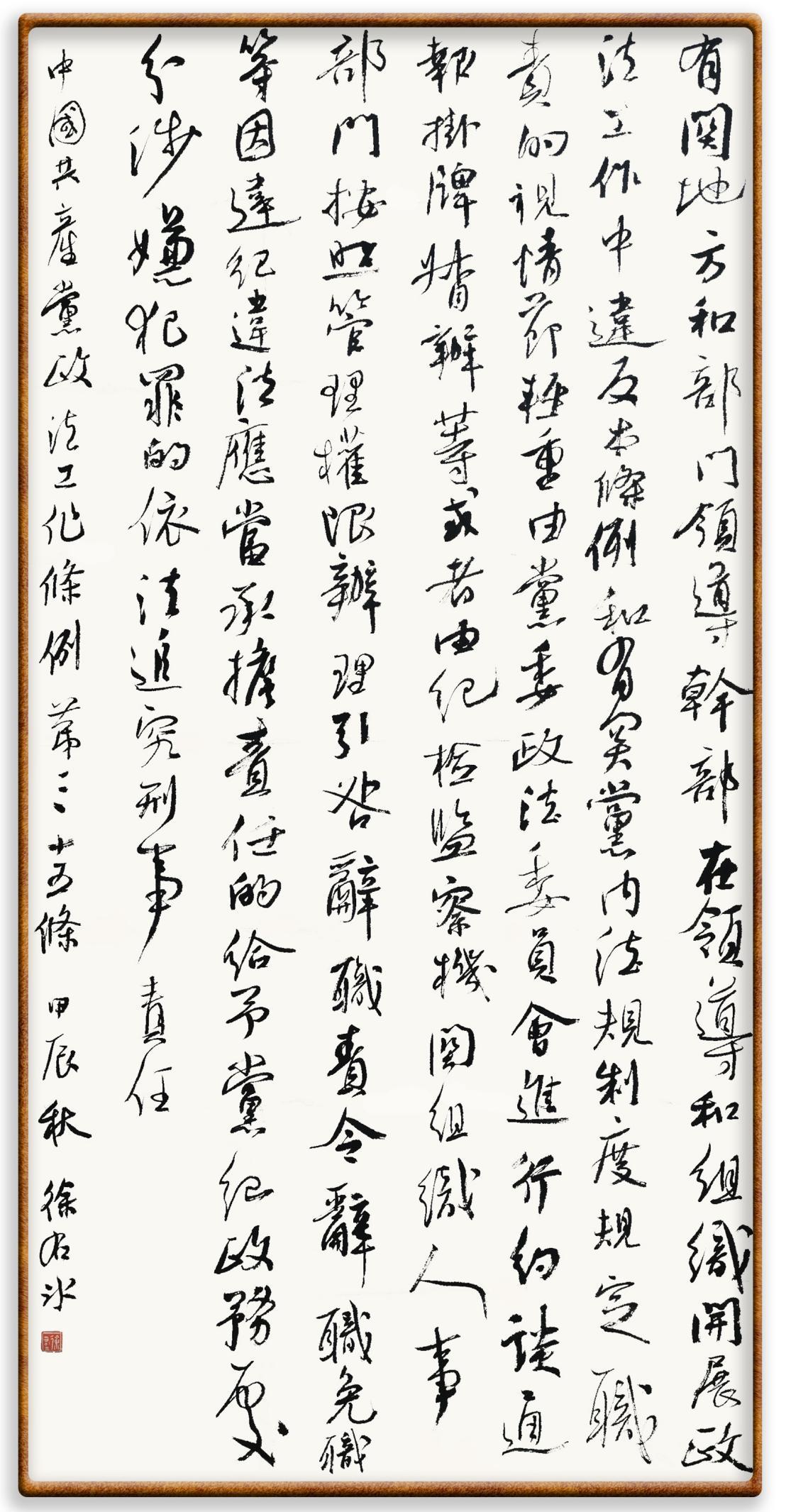 《中國共產(chǎn)黨政法工作條例》對黨領導新時代政法工作進行全面制度擘畫,為黨領導政法工作提供基本遵循,具有重大而深遠的意義。為學習好、宣傳好、貫徹好、實施好這部黨內法規(guī),繼《中華人民共和國民法典》《中華人民共和國憲法》《信訪工作條例》《中華人民共和國澳門特別行政區(qū)基本法》《中華人民共和國香港特別行政區(qū)基本法》等法律法規(guī)之后,“書·法”系列活動將筆端對準《中國共產(chǎn)黨政法工作條例》。