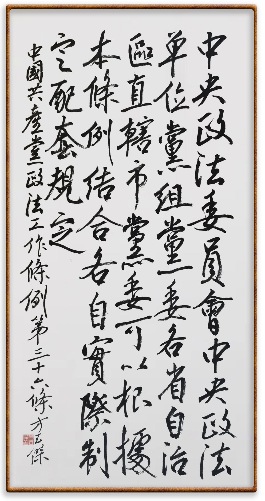 《中國(guó)共產(chǎn)黨政法工作條例》對(duì)黨領(lǐng)導(dǎo)新時(shí)代政法工作進(jìn)行全面制度擘畫,為黨領(lǐng)導(dǎo)政法工作提供基本遵循,具有重大而深遠(yuǎn)的意義。為學(xué)習(xí)好、宣傳好、貫徹好、實(shí)施好這部黨內(nèi)法規(guī),繼《中華人民共和國(guó)民法典》《中華人民共和國(guó)憲法》《信訪工作條例》《中華人民共和國(guó)澳門特別行政區(qū)基本法》《中華人民共和國(guó)香港特別行政區(qū)基本法》等法律法規(guī)之后,“書·法”系列活動(dòng)將筆端對(duì)準(zhǔn)《中國(guó)共產(chǎn)黨政法工作條例》。