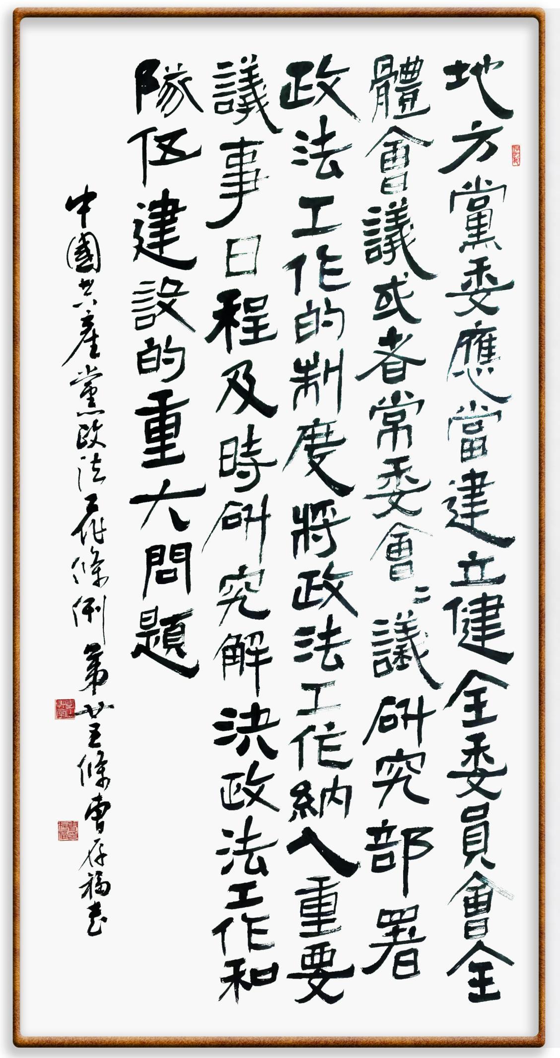 《中國共產(chǎn)黨政法工作條例》對黨領(lǐng)導(dǎo)新時代政法工作進(jìn)行全面制度擘畫,為黨領(lǐng)導(dǎo)政法工作提供基本遵循,具有重大而深遠(yuǎn)的意義。為學(xué)習(xí)好、宣傳好、貫徹好、實(shí)施好這部黨內(nèi)法規(guī),繼《中華人民共和國民法典》《中華人民共和國憲法》《信訪工作條例》《中華人民共和國澳門特別行政區(qū)基本法》《中華人民共和國香港特別行政區(qū)基本法》等法律法規(guī)之后,“書·法”系列活動將筆端對準(zhǔn)《中國共產(chǎn)黨政法工作條例》。
