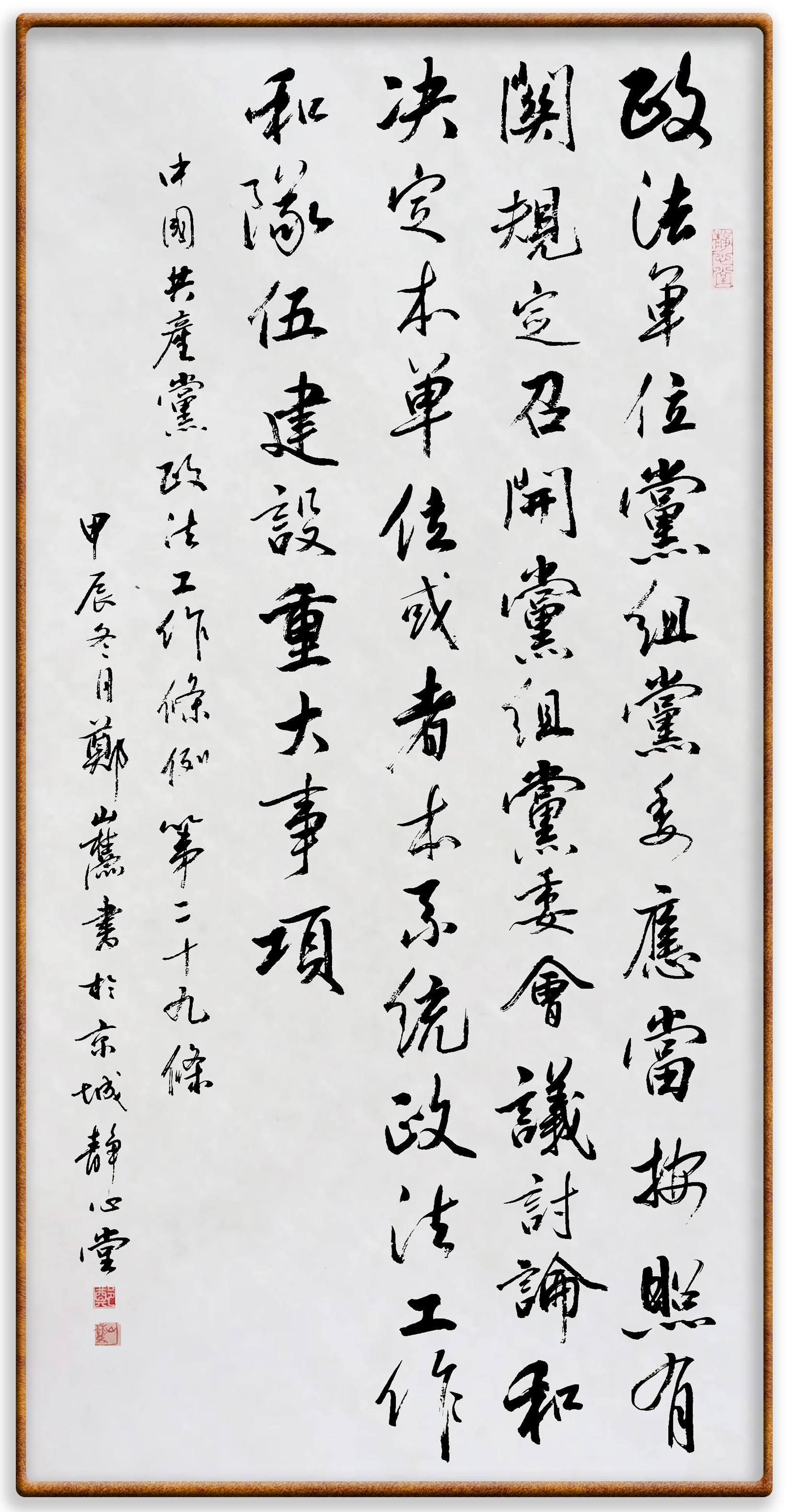 《中國共產(chǎn)黨政法工作條例》對黨領(lǐng)導(dǎo)新時代政法工作進(jìn)行全面制度擘畫,為黨領(lǐng)導(dǎo)政法工作提供基本遵循,具有重大而深遠(yuǎn)的意義。為學(xué)習(xí)好、宣傳好、貫徹好、實(shí)施好這部黨內(nèi)法規(guī),繼《中華人民共和國民法典》《中華人民共和國憲法》《信訪工作條例》《中華人民共和國澳門特別行政區(qū)基本法》《中華人民共和國香港特別行政區(qū)基本法》等法律法規(guī)之后,“書·法”系列活動將筆端對準(zhǔn)《中國共產(chǎn)黨政法工作條例》。精彩內(nèi)容,敬請關(guān)注。
