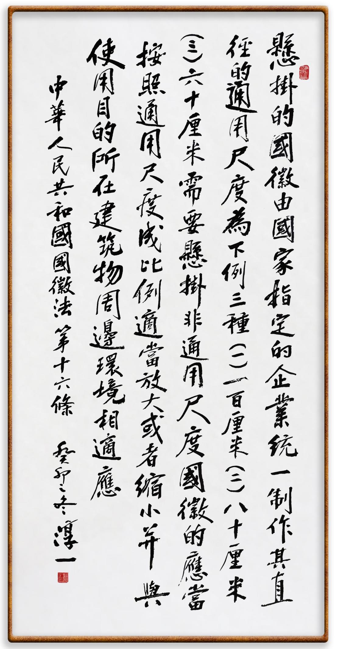 需要懸掛非通用尺度國徽的,應(yīng)當(dāng)按照通用尺度成比例適當(dāng)放大或者縮小,并與使用目的、所在建筑物、周邊環(huán)境相適應(yīng)。