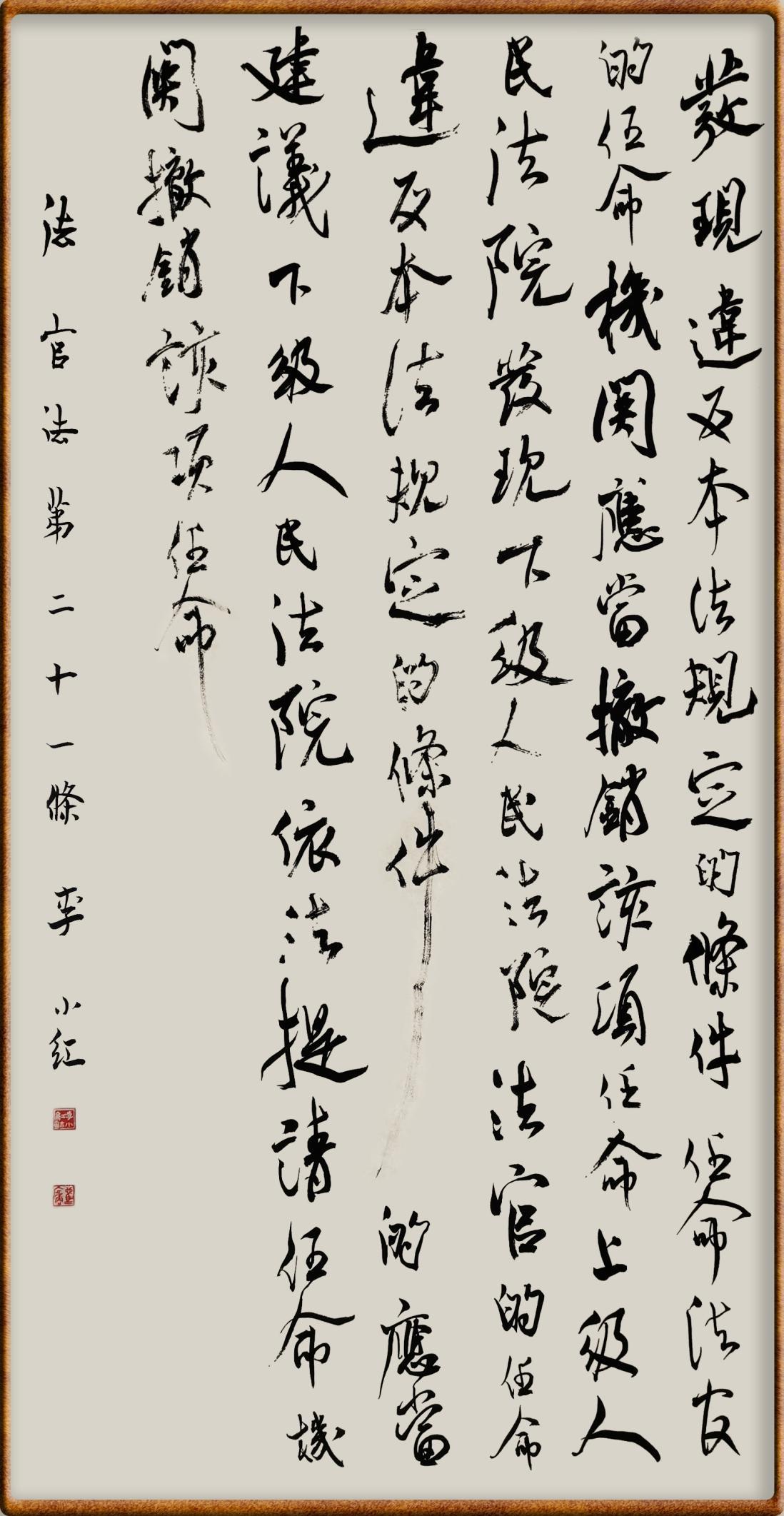 李小紅,中國法官文聯(lián)書法專業(yè)委員會會員,廣東省韶關市書法家協(xié)會會員,始興縣人民法院綜合辦公室干警。