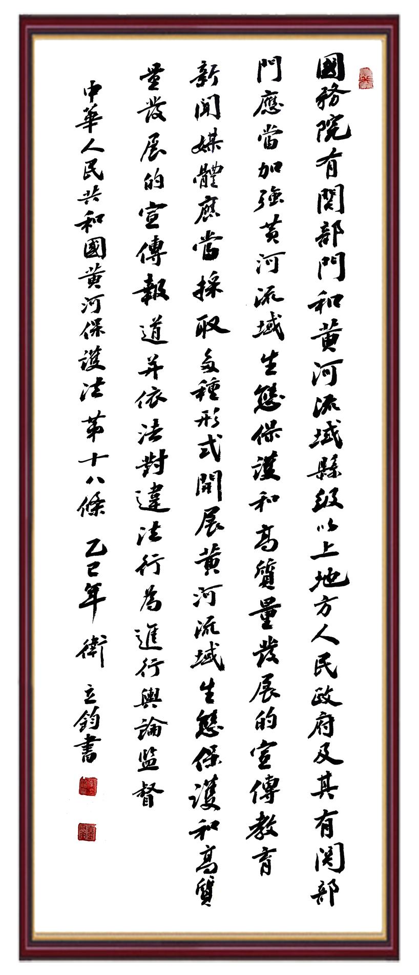 黃河寧,天下平。黃河是中華民族的發(fā)源地和搖籃,保護黃河是事關(guān)中華民族偉大復(fù)興的千秋大計?!吨腥A人民共和國黃河保護法》為推進水資源節(jié)約集約利用、保護傳承弘揚黃河文化、推動黃河流域生態(tài)保護和高質(zhì)量發(fā)展提供了有力法治保障。繼書寫《中華人民共和國民法典》《中華人民共和國憲法》《中華人民共和國澳門特別行政區(qū)基本法》《中華人民共和國香港特別行政區(qū)基本法》《中華人民共和國國旗法》《中華人民共和國國徽法》《中華人民共和國國歌法》《中華人民共和國法官法》等法律法規(guī)之后,法制日報社聯(lián)合沿黃九?。▍^(qū))司法廳、書法家協(xié)會,將筆端對準《中華人民共和國黃河保護法》。