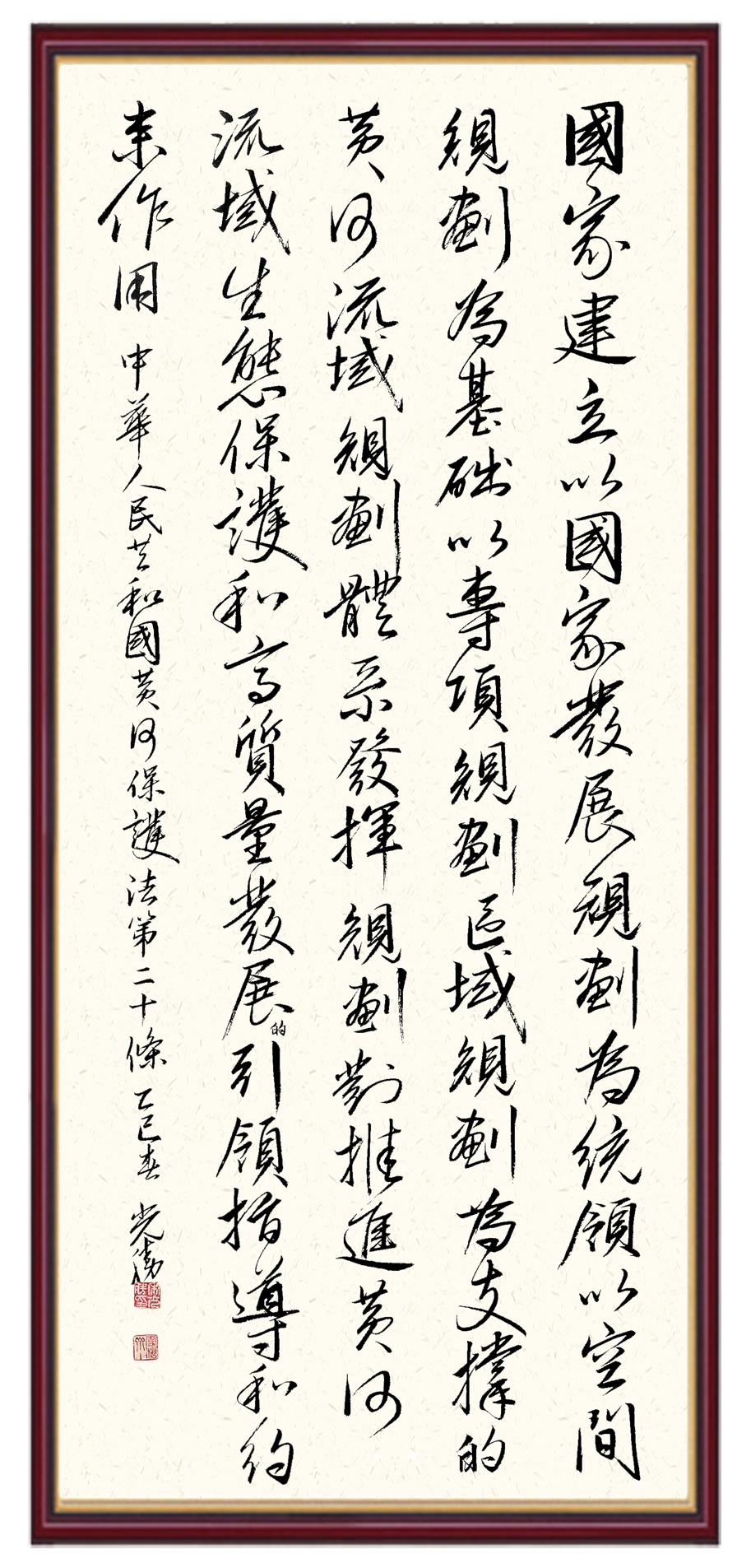 黃河寧,天下平。黃河是中華民族的發(fā)源地和搖籃,保護黃河是事關(guān)中華民族偉大復(fù)興的千秋大計?!吨腥A人民共和國黃河保護法》為推進水資源節(jié)約集約利用、保護傳承弘揚黃河文化、推動黃河流域生態(tài)保護和高質(zhì)量發(fā)展提供了有力法治保障。繼書寫《中華人民共和國民法典》《中華人民共和國憲法》《中華人民共和國澳門特別行政區(qū)基本法》《中華人民共和國香港特別行政區(qū)基本法》《中華人民共和國國旗法》《中華人民共和國國徽法》《中華人民共和國國歌法》《中華人民共和國法官法》等法律法規(guī)之后,法制日報社聯(lián)合沿黃九?。▍^(qū))司法廳、書法家協(xié)會,將筆端對準(zhǔn)《中華人民共和國黃河保護法》。