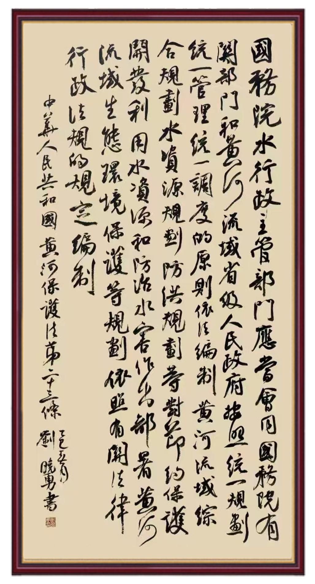 黃河寧,天下平。黃河是中華民族的發(fā)源地和搖籃,保護(hù)黃河是事關(guān)中華民族偉大復(fù)興的千秋大計(jì)?!吨腥A人民共和國黃河保護(hù)法》為推進(jìn)水資源節(jié)約集約利用、保護(hù)傳承弘揚(yáng)黃河文化、推動(dòng)黃河流域生態(tài)保護(hù)和高質(zhì)量發(fā)展提供了有力法治保障。繼書寫《中華人民共和國民法典》《中華人民共和國憲法》《中華人民共和國澳門特別行政區(qū)基本法》《中華人民共和國香港特別行政區(qū)基本法》《中華人民共和國國旗法》《中華人民共和國國徽法》《中華人民共和國國歌法》《中華人民共和國法官法》等法律法規(guī)之后,法制日報(bào)社聯(lián)合沿黃九?。▍^(qū))司法廳、書法家協(xié)會(huì),將筆端對準(zhǔn)《中華人民共和國黃河保護(hù)法》。
