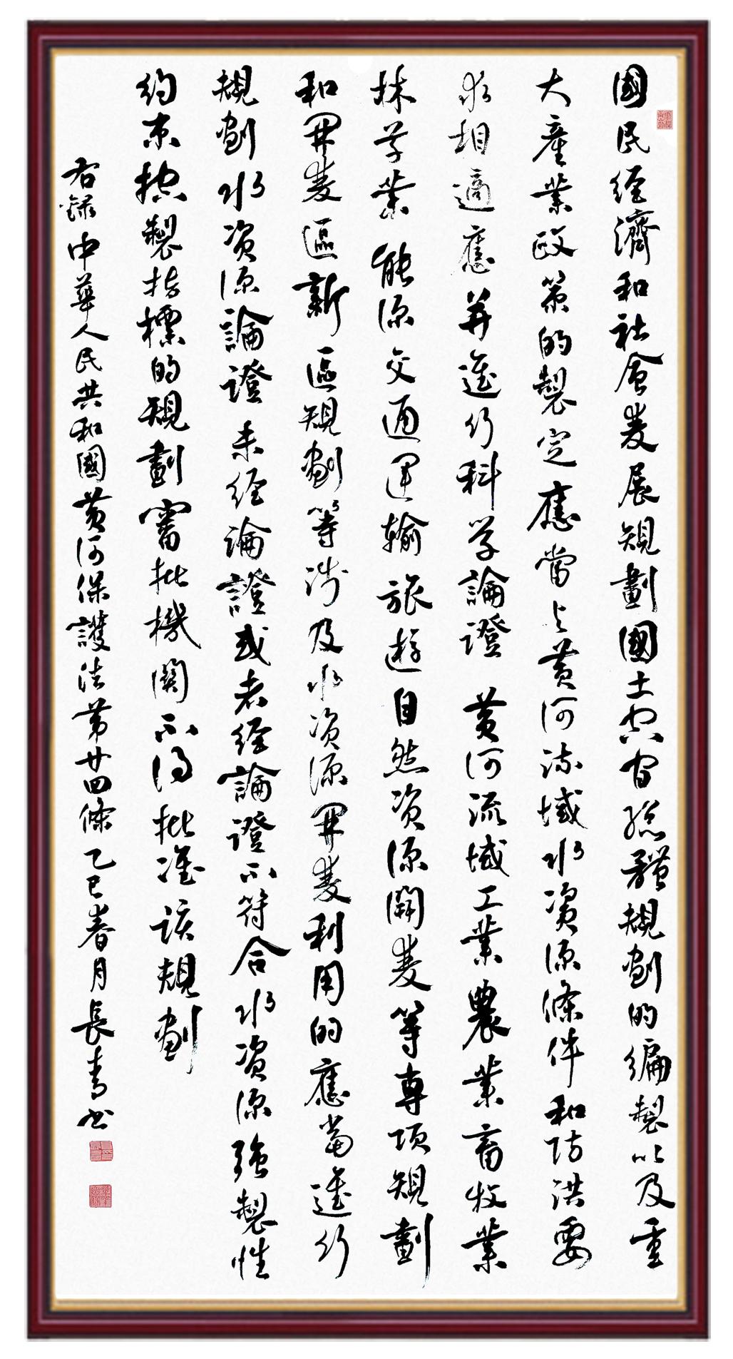 黃河寧,天下平。黃河是中華民族的發(fā)源地和搖籃,保護黃河是事關中華民族偉大復興的千秋大計?!吨腥A人民共和國黃河保護法》為推進水資源節(jié)約集約利用、保護傳承弘揚黃河文化、推動黃河流域生態(tài)保護和高質量發(fā)展提供了有力法治保障。繼書寫《中華人民共和國民法典》《中華人民共和國憲法》《中華人民共和國澳門特別行政區(qū)基本法》《中華人民共和國香港特別行政區(qū)基本法》《中華人民共和國國旗法》《中華人民共和國國徽法》《中華人民共和國國歌法》《中華人民共和國法官法》等法律法規(guī)之后,法制日報社聯(lián)合沿黃九?。▍^(qū))司法廳、書法家協(xié)會,將筆端對準《中華人民共和國黃河保護法》。