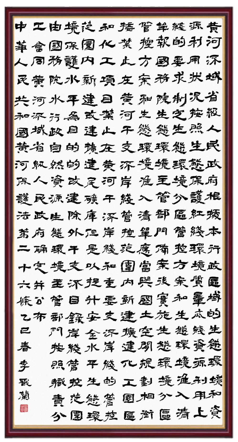 黃河寧,天下平。黃河是中華民族的發(fā)源地和搖籃,保護(hù)黃河是事關(guān)中華民族偉大復(fù)興的千秋大計(jì)?!吨腥A人民共和國(guó)黃河保護(hù)法》為推進(jìn)水資源節(jié)約集約利用、保護(hù)傳承弘揚(yáng)黃河文化、推動(dòng)黃河流域生態(tài)保護(hù)和高質(zhì)量發(fā)展提供了有力法治保障。繼書(shū)寫(xiě)《中華人民共和國(guó)民法典》《中華人民共和國(guó)憲法》《中華人民共和國(guó)澳門(mén)特別行政區(qū)基本法》《中華人民共和國(guó)香港特別行政區(qū)基本法》《中華人民共和國(guó)國(guó)旗法》《中華人民共和國(guó)國(guó)徽法》《中華人民共和國(guó)國(guó)歌法》《中華人民共和國(guó)法官法》等法律法規(guī)之后,法制日?qǐng)?bào)社聯(lián)合沿黃九省(區(qū))司法廳、書(shū)法家協(xié)會(huì),將筆端對(duì)準(zhǔn)《中華人民共和國(guó)黃河保護(hù)法》。