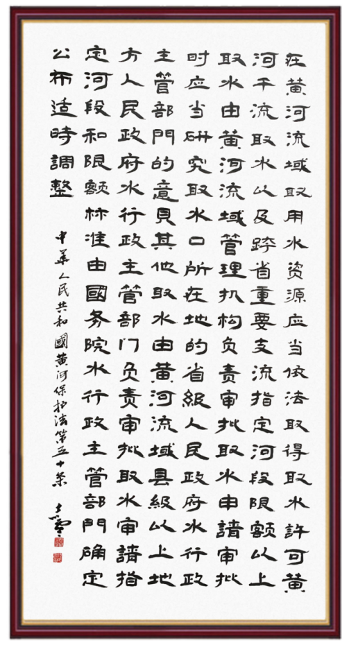 黃河寧,天下平。黃河是中華民族的發(fā)源地和搖籃,保護(hù)黃河是事關(guān)中華民族偉大復(fù)興的千秋大計?!吨腥A人民共和國黃河保護(hù)法》為推進(jìn)水資源節(jié)約集約利用、保護(hù)傳承弘揚黃河文化、推動黃河流域生態(tài)保護(hù)和高質(zhì)量發(fā)展提供了有力法治保障。繼書寫《中華人民共和國民法典》《中華人民共和國憲法》《中華人民共和國澳門特別行政區(qū)基本法》《中華人民共和國香港特別行政區(qū)基本法》《中華人民共和國國旗法》《中華人民共和國國徽法》《中華人民共和國國歌法》《中華人民共和國法官法》等法律法規(guī)之后,法制日報社聯(lián)合沿黃九?。▍^(qū))司法廳、書法家協(xié)會,將筆端對準(zhǔn)《中華人民共和國黃河保護(hù)法》。