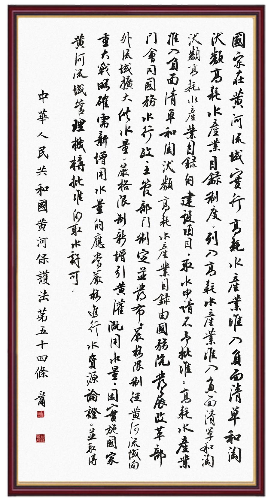 黃河寧,天下平。黃河是中華民族的發(fā)源地和搖籃,保護(hù)黃河是事關(guān)中華民族偉大復(fù)興的千秋大計(jì)?!吨腥A人民共和國黃河保護(hù)法》為推進(jìn)水資源節(jié)約集約利用、保護(hù)傳承弘揚(yáng)黃河文化、推動(dòng)黃河流域生態(tài)保護(hù)和高質(zhì)量發(fā)展提供了有力法治保障。繼書寫《中華人民共和國民法典》《中華人民共和國憲法》《中華人民共和國澳門特別行政區(qū)基本法》《中華人民共和國香港特別行政區(qū)基本法》《中華人民共和國國旗法》《中華人民共和國國徽法》《中華人民共和國國歌法》《中華人民共和國法官法》等法律法規(guī)之后,法制日報(bào)社聯(lián)合沿黃九省(區(qū))司法廳、書法家協(xié)會(huì),將筆端對準(zhǔn)《中華人民共和國黃河保護(hù)法》。