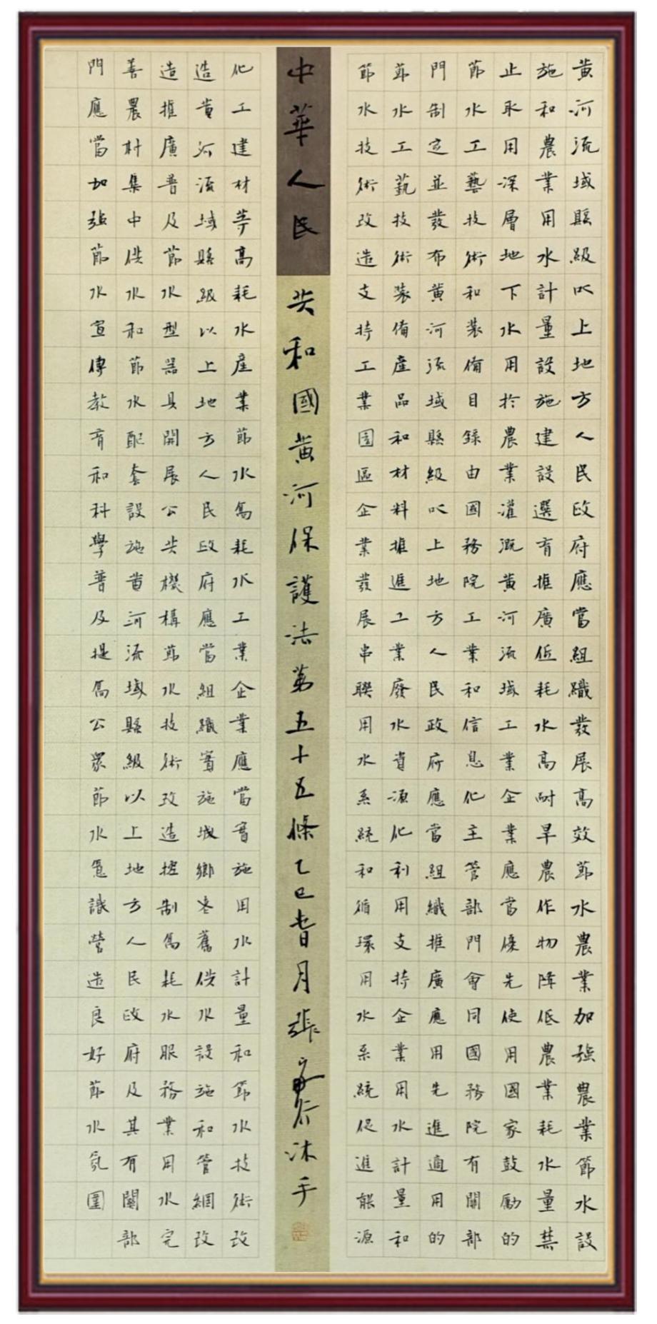 黃河寧,天下平。黃河是中華民族的發(fā)源地和搖籃,保護黃河是事關中華民族偉大復興的千秋大計。《中華人民共和國黃河保護法》為推進水資源節(jié)約集約利用、保護傳承弘揚黃河文化、推動黃河流域生態(tài)保護和高質量發(fā)展提供了有力法治保障。繼書寫《中華人民共和國民法典》《中華人民共和國憲法》《中華人民共和國澳門特別行政區(qū)基本法》《中華人民共和國香港特別行政區(qū)基本法》《中華人民共和國國旗法》《中華人民共和國國徽法》《中華人民共和國國歌法》《中華人民共和國法官法》等法律法規(guī)之后,法制日報社聯(lián)合沿黃九?。▍^(qū))司法廳、書法家協(xié)會,將筆端對準《中華人民共和國黃河保護法》。