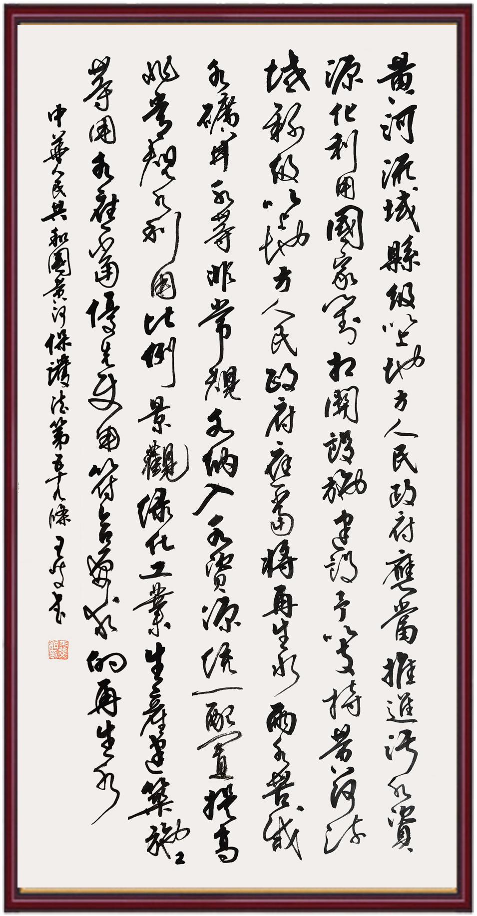 黃河寧,天下平。黃河是中華民族的發(fā)源地和搖籃,保護黃河是事關(guān)中華民族偉大復(fù)興的千秋大計?!吨腥A人民共和國黃河保護法》為推進水資源節(jié)約集約利用、保護傳承弘揚黃河文化、推動黃河流域生態(tài)保護和高質(zhì)量發(fā)展提供了有力法治保障。繼書寫《中華人民共和國民法典》《中華人民共和國憲法》《中華人民共和國澳門特別行政區(qū)基本法》《中華人民共和國香港特別行政區(qū)基本法》《中華人民共和國國旗法》《中華人民共和國國徽法》《中華人民共和國國歌法》《中華人民共和國法官法》等法律法規(guī)之后,法制日報社聯(lián)合沿黃九?。▍^(qū))司法廳、書法家協(xié)會,將筆端對準《中華人民共和國黃河保護法》。