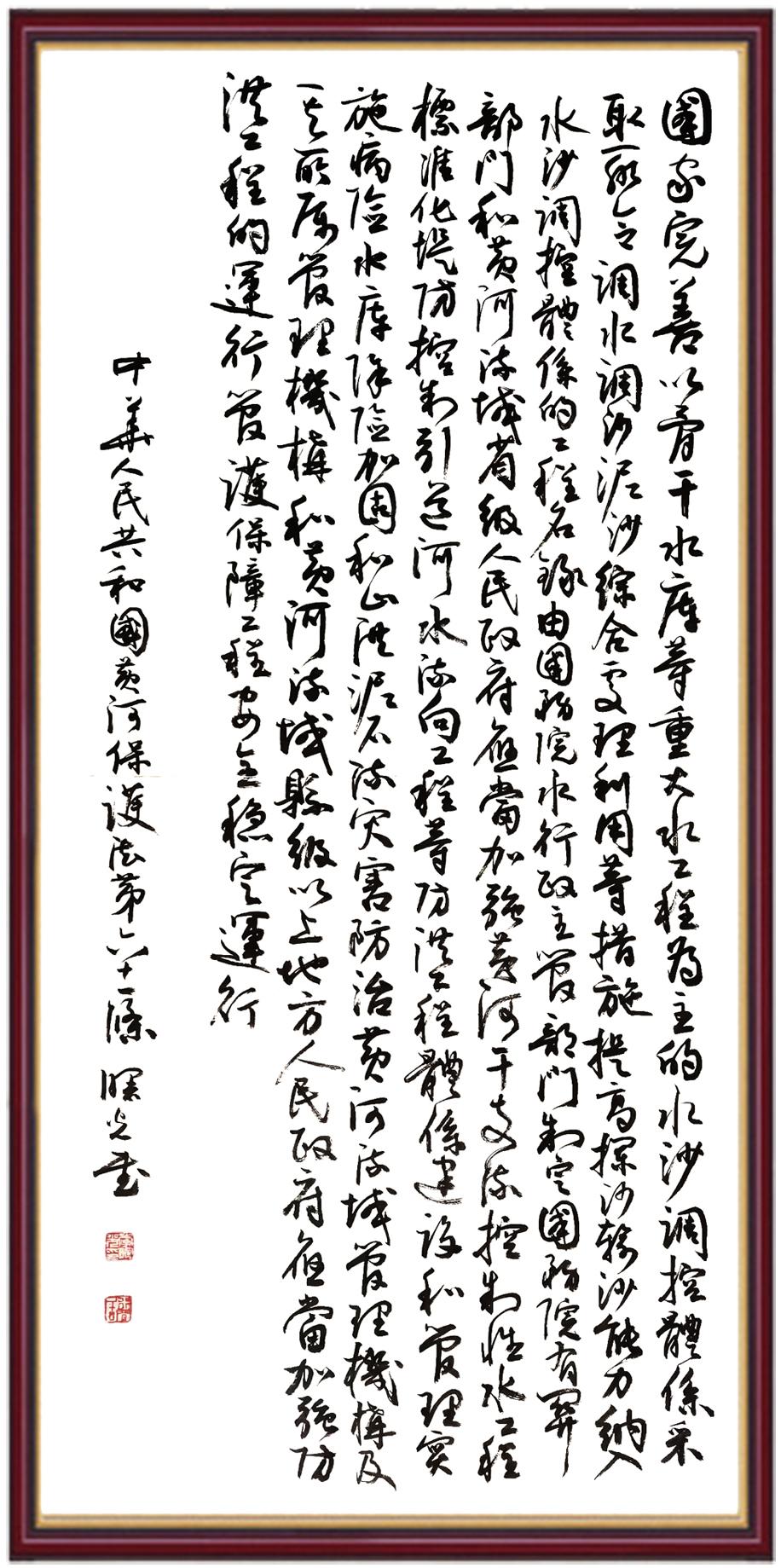 黃河寧,天下平。黃河是中華民族的發(fā)源地和搖籃,保護(hù)黃河是事關(guān)中華民族偉大復(fù)興的千秋大計(jì)?!吨腥A人民共和國(guó)黃河保護(hù)法》為推進(jìn)水資源節(jié)約集約利用、保護(hù)傳承弘揚(yáng)黃河文化、推動(dòng)黃河流域生態(tài)保護(hù)和高質(zhì)量發(fā)展提供了有力法治保障。繼書寫《中華人民共和國(guó)民法典》《中華人民共和國(guó)憲法》《中華人民共和國(guó)澳門特別行政區(qū)基本法》《中華人民共和國(guó)香港特別行政區(qū)基本法》《中華人民共和國(guó)國(guó)旗法》《中華人民共和國(guó)國(guó)徽法》《中華人民共和國(guó)國(guó)歌法》《中華人民共和國(guó)法官法》等法律法規(guī)之后,法制日?qǐng)?bào)社聯(lián)合沿黃九?。▍^(qū))司法廳、書法家協(xié)會(huì),將筆端對(duì)準(zhǔn)《中華人民共和國(guó)黃河保護(hù)法》。