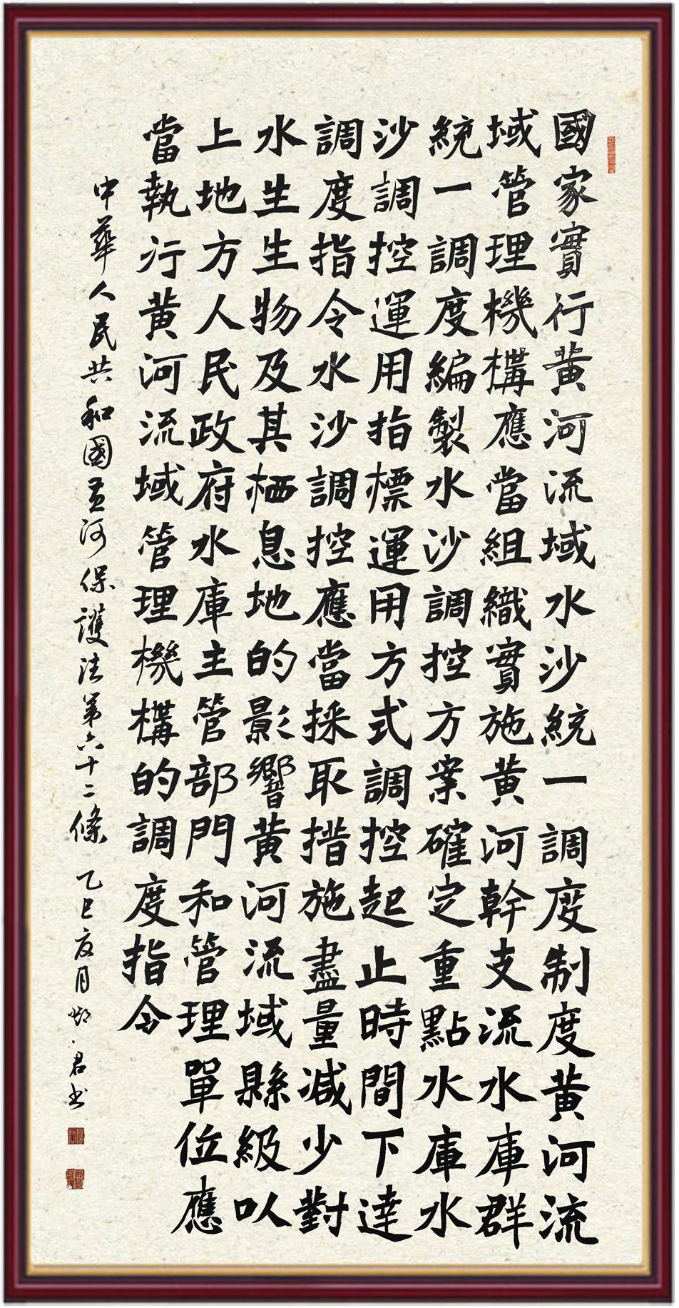 黃河寧,天下平。黃河是中華民族的發(fā)源地和搖籃,保護(hù)黃河是事關(guān)中華民族偉大復(fù)興的千秋大計(jì)。《中華人民共和國黃河保護(hù)法》為推進(jìn)水資源節(jié)約集約利用、保護(hù)傳承弘揚(yáng)黃河文化、推動黃河流域生態(tài)保護(hù)和高質(zhì)量發(fā)展提供了有力法治保障。繼書寫《中華人民共和國民法典》《中華人民共和國憲法》《中華人民共和國澳門特別行政區(qū)基本法》《中華人民共和國香港特別行政區(qū)基本法》《中華人民共和國國旗法》《中華人民共和國國徽法》《中華人民共和國國歌法》《中華人民共和國法官法》等法律法規(guī)之后,法制日報(bào)社聯(lián)合沿黃九省(區(qū))司法廳、書法家協(xié)會,將筆端對準(zhǔn)《中華人民共和國黃河保護(hù)法》。