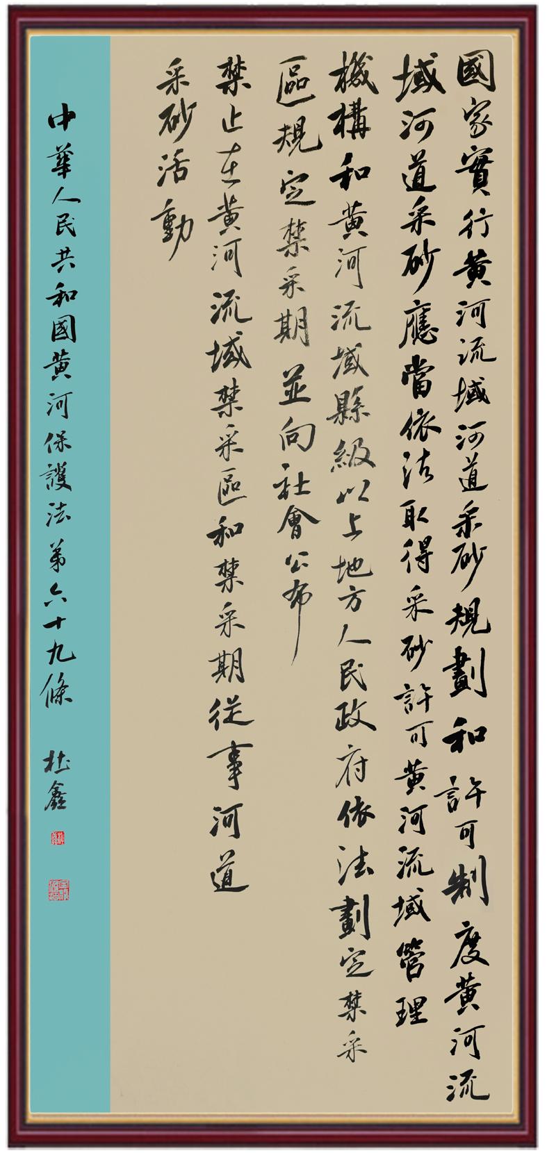 黃河寧,天下平。黃河是中華民族的發(fā)源地和搖籃,保護黃河是事關中華民族偉大復興的千秋大計?!吨腥A人民共和國黃河保護法》為推進水資源節(jié)約集約利用、保護傳承弘揚黃河文化、推動黃河流域生態(tài)保護和高質(zhì)量發(fā)展提供了有力法治保障。繼書寫《中華人民共和國民法典》《中華人民共和國憲法》《中華人民共和國澳門特別行政區(qū)基本法》《中華人民共和國香港特別行政區(qū)基本法》《中華人民共和國國旗法》《中華人民共和國國徽法》《中華人民共和國國歌法》《中華人民共和國法官法》等法律法規(guī)之后,法制日報社聯(lián)合沿黃九省(區(qū))司法廳、書法家協(xié)會,將筆端對準《中華人民共和國黃河保護法》。