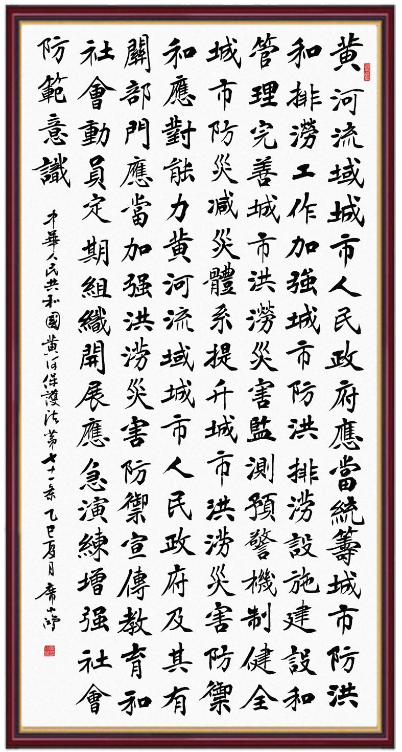 黃河寧,天下平。黃河是中華民族的發(fā)源地和搖籃,保護黃河是事關(guān)中華民族偉大復興的千秋大計。《中華人民共和國黃河保護法》為推進水資源節(jié)約集約利用、保護傳承弘揚黃河文化、推動黃河流域生態(tài)保護和高質(zhì)量發(fā)展提供了有力法治保障。繼書寫《中華人民共和國民法典》《中華人民共和國憲法》《中華人民共和國澳門特別行政區(qū)基本法》《中華人民共和國香港特別行政區(qū)基本法》《中華人民共和國國旗法》《中華人民共和國國徽法》《中華人民共和國國歌法》《中華人民共和國法官法》等法律法規(guī)之后,法制日報社聯(lián)合沿黃九?。▍^(qū))司法廳、書法家協(xié)會,將筆端對準《中華人民共和國黃河保護法》。