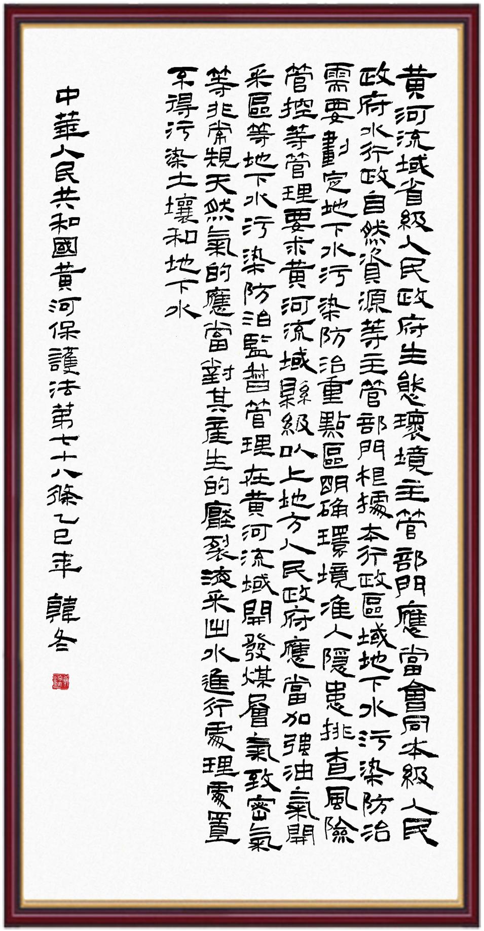黃河寧,天下平。黃河是中華民族的發(fā)源地和搖籃,保護(hù)黃河是事關(guān)中華民族偉大復(fù)興的千秋大計?!吨腥A人民共和國黃河保護(hù)法》為推進(jìn)水資源節(jié)約集約利用、保護(hù)傳承弘揚(yáng)黃河文化、推動黃河流域生態(tài)保護(hù)和高質(zhì)量發(fā)展提供了有力法治保障。繼書寫《中華人民共和國民法典》《中華人民共和國憲法》《中華人民共和國澳門特別行政區(qū)基本法》《中華人民共和國香港特別行政區(qū)基本法》《中華人民共和國國旗法》《中華人民共和國國徽法》《中華人民共和國國歌法》《中華人民共和國法官法》等法律法規(guī)之后,法制日報社聯(lián)合沿黃九?。▍^(qū))司法廳、書法家協(xié)會,將筆端對準(zhǔn)《中華人民共和國黃河保護(hù)法》。