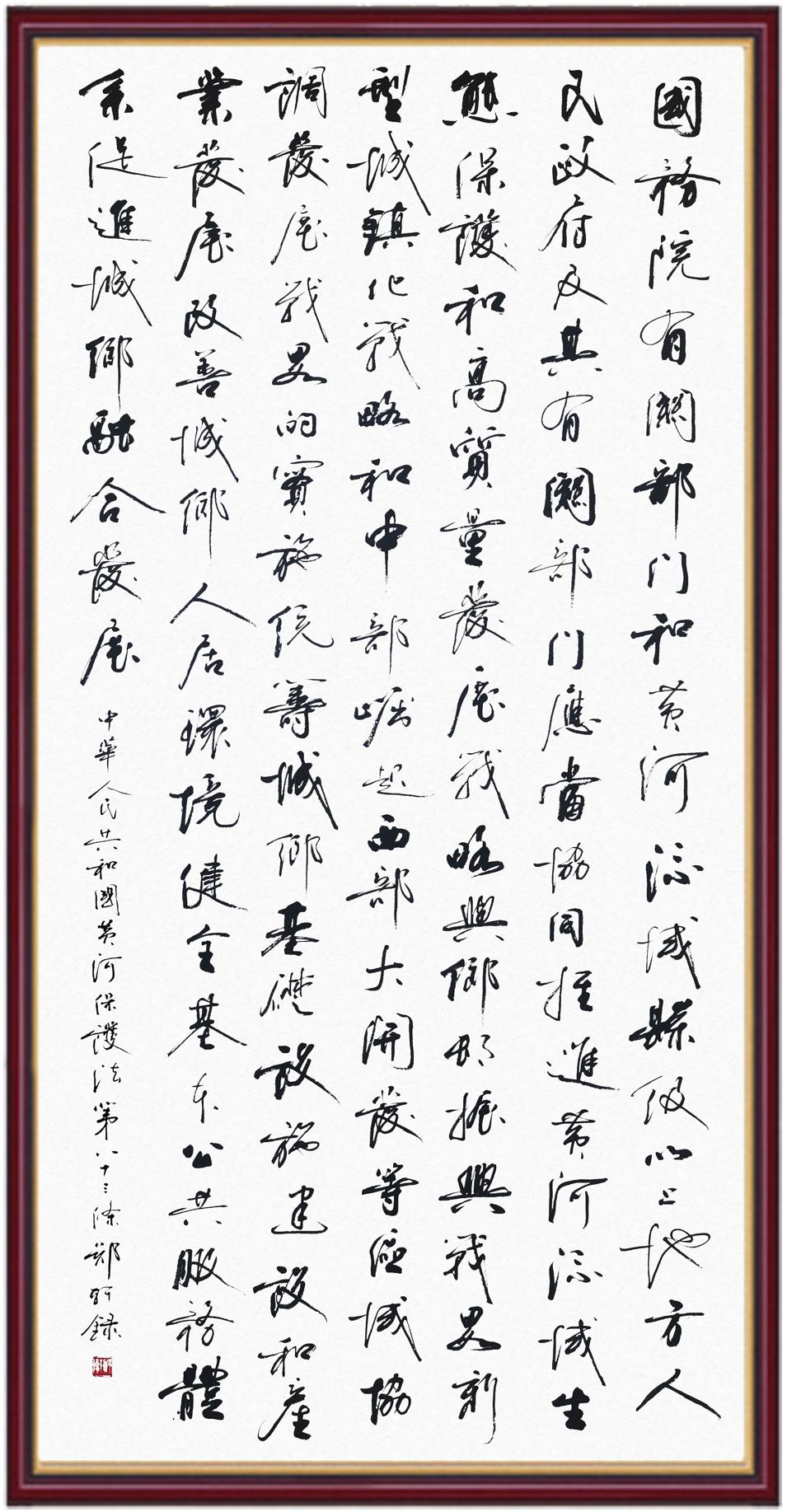黃河寧,天下平。黃河是中華民族的發(fā)源地和搖籃,保護(hù)黃河是事關(guān)中華民族偉大復(fù)興的千秋大計(jì)。《中華人民共和國(guó)黃河保護(hù)法》為推進(jìn)水資源節(jié)約集約利用、保護(hù)傳承弘揚(yáng)黃河文化、推動(dòng)黃河流域生態(tài)保護(hù)和高質(zhì)量發(fā)展提供了有力法治保障。繼書(shū)寫(xiě)《中華人民共和國(guó)民法典》《中華人民共和國(guó)憲法》《中華人民共和國(guó)澳門(mén)特別行政區(qū)基本法》《中華人民共和國(guó)香港特別行政區(qū)基本法》《中華人民共和國(guó)國(guó)旗法》《中華人民共和國(guó)國(guó)徽法》《中華人民共和國(guó)國(guó)歌法》《中華人民共和國(guó)法官法》等法律法規(guī)之后,法制日?qǐng)?bào)社聯(lián)合沿黃九省(區(qū))司法廳、書(shū)法家協(xié)會(huì),將筆端對(duì)準(zhǔn)《中華人民共和國(guó)黃河保護(hù)法》。