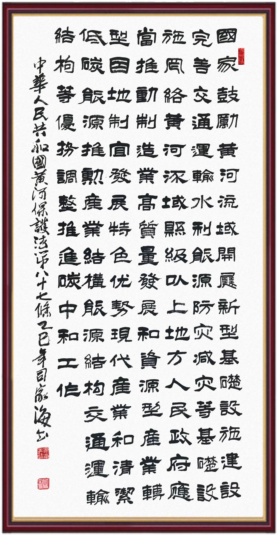 黃河寧,天下平。黃河是中華民族的發(fā)源地和搖籃,保護(hù)黃河是事關(guān)中華民族偉大復(fù)興的千秋大計(jì)?!吨腥A人民共和國黃河保護(hù)法》為推進(jìn)水資源節(jié)約集約利用、保護(hù)傳承弘揚(yáng)黃河文化、推動黃河流域生態(tài)保護(hù)和高質(zhì)量發(fā)展提供了有力法治保障。繼書寫《中華人民共和國民法典》《中華人民共和國憲法》《中華人民共和國澳門特別行政區(qū)基本法》《中華人民共和國香港特別行政區(qū)基本法》《中華人民共和國國旗法》《中華人民共和國國徽法》《中華人民共和國國歌法》《中華人民共和國法官法》等法律法規(guī)之后,法制日報(bào)社聯(lián)合沿黃九?。▍^(qū))司法廳、書法家協(xié)會,將筆端對準(zhǔn)《中華人民共和國黃河保護(hù)法》。