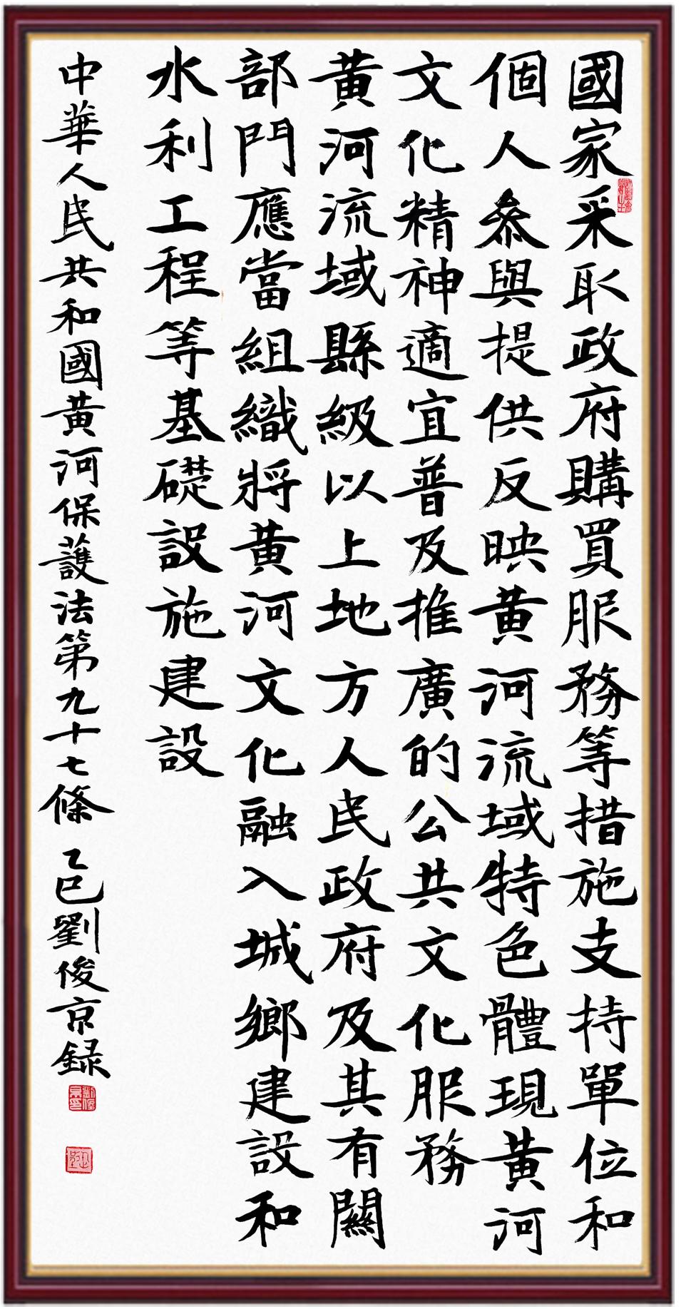黃河寧,天下平。黃河是中華民族的發(fā)源地和搖籃,保護(hù)黃河是事關(guān)中華民族偉大復(fù)興的千秋大計(jì)?!吨腥A人民共和國黃河保護(hù)法》為推進(jìn)水資源節(jié)約集約利用、保護(hù)傳承弘揚(yáng)黃河文化、推動(dòng)黃河流域生態(tài)保護(hù)和高質(zhì)量發(fā)展提供了有力法治保障。繼書寫《中華人民共和國民法典》《中華人民共和國憲法》《中華人民共和國澳門特別行政區(qū)基本法》《中華人民共和國香港特別行政區(qū)基本法》《中華人民共和國國旗法》《中華人民共和國國徽法》《中華人民共和國國歌法》《中華人民共和國法官法》等法律法規(guī)之后,法制日報(bào)社聯(lián)合沿黃九?。▍^(qū))司法廳、書法家協(xié)會(huì),將筆端對準(zhǔn)《中華人民共和國黃河保護(hù)法》。