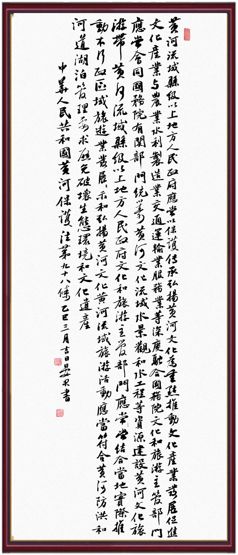 黃河寧,天下平。黃河是中華民族的發(fā)源地和搖籃,保護(hù)黃河是事關(guān)中華民族偉大復(fù)興的千秋大計(jì)?!吨腥A人民共和國(guó)黃河保護(hù)法》為推進(jìn)水資源節(jié)約集約利用、保護(hù)傳承弘揚(yáng)黃河文化、推動(dòng)黃河流域生態(tài)保護(hù)和高質(zhì)量發(fā)展提供了有力法治保障。繼書(shū)寫(xiě)《中華人民共和國(guó)民法典》《中華人民共和國(guó)憲法》《中華人民共和國(guó)澳門特別行政區(qū)基本法》《中華人民共和國(guó)香港特別行政區(qū)基本法》《中華人民共和國(guó)國(guó)旗法》《中華人民共和國(guó)國(guó)徽法》《中華人民共和國(guó)國(guó)歌法》《中華人民共和國(guó)法官法》等法律法規(guī)之后,法制日?qǐng)?bào)社聯(lián)合沿黃九省(區(qū))司法廳、書(shū)法家協(xié)會(huì),將筆端對(duì)準(zhǔn)《中華人民共和國(guó)黃河保護(hù)法》。