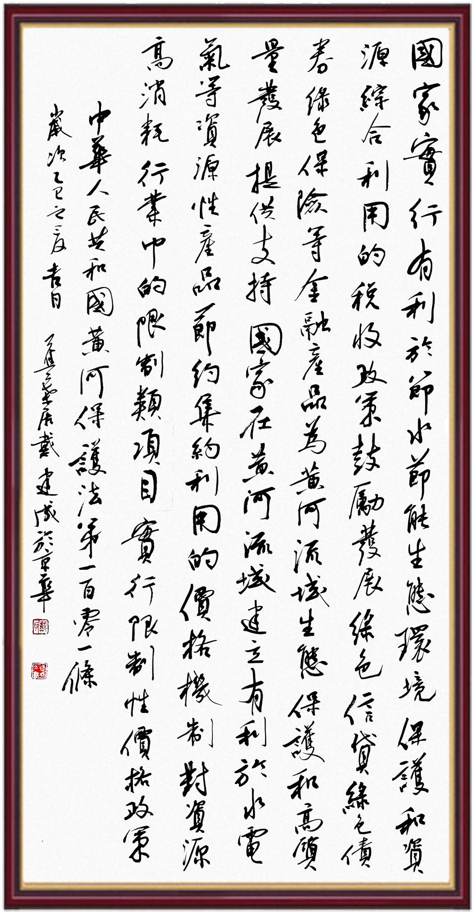 黃河寧,天下平。黃河是中華民族的發(fā)源地和搖籃,保護(hù)黃河是事關(guān)中華民族偉大復(fù)興的千秋大計(jì)。《中華人民共和國(guó)黃河保護(hù)法》為推進(jìn)水資源節(jié)約集約利用、保護(hù)傳承弘揚(yáng)黃河文化、推動(dòng)黃河流域生態(tài)保護(hù)和高質(zhì)量發(fā)展提供了有力法治保障。繼書寫《中華人民共和國(guó)民法典》《中華人民共和國(guó)憲法》《中華人民共和國(guó)澳門特別行政區(qū)基本法》《中華人民共和國(guó)香港特別行政區(qū)基本法》《中華人民共和國(guó)國(guó)旗法》《中華人民共和國(guó)國(guó)徽法》《中華人民共和國(guó)國(guó)歌法》《中華人民共和國(guó)法官法》等法律法規(guī)之后,法制日?qǐng)?bào)社聯(lián)合沿黃九?。▍^(qū))司法廳、書法家協(xié)會(huì),將筆端對(duì)準(zhǔn)《中華人民共和國(guó)黃河保護(hù)法》。