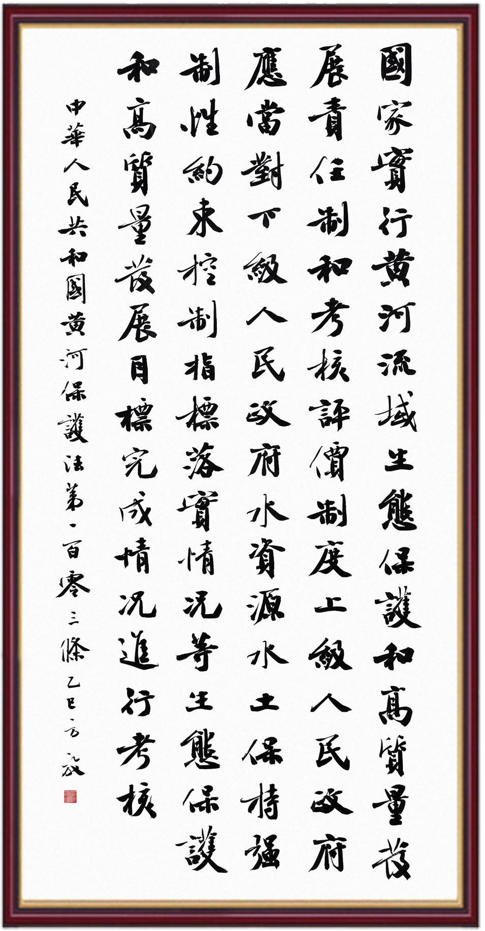 黃河寧,天下平。黃河是中華民族的發(fā)源地和搖籃,保護(hù)黃河是事關(guān)中華民族偉大復(fù)興的千秋大計(jì)?!吨腥A人民共和國黃河保護(hù)法》為推進(jìn)水資源節(jié)約集約利用、保護(hù)傳承弘揚(yáng)黃河文化、推動(dòng)黃河流域生態(tài)保護(hù)和高質(zhì)量發(fā)展提供了有力法治保障。繼書寫《中華人民共和國民法典》《中華人民共和國憲法》《中華人民共和國澳門特別行政區(qū)基本法》《中華人民共和國香港特別行政區(qū)基本法》《中華人民共和國國旗法》《中華人民共和國國徽法》《中華人民共和國國歌法》《中華人民共和國法官法》等法律法規(guī)之后,法制日?qǐng)?bào)社聯(lián)合沿黃九省(區(qū))司法廳、書法家協(xié)會(huì),將筆端對(duì)準(zhǔn)《中華人民共和國黃河保護(hù)法》。