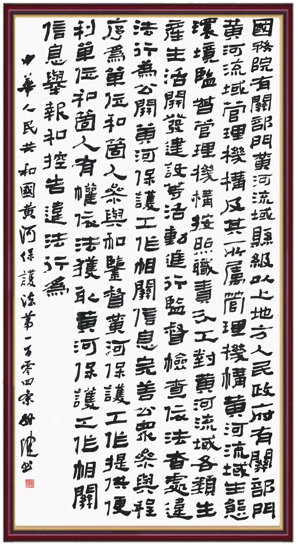 黃河寧,天下平。黃河是中華民族的發(fā)源地和搖籃,保護(hù)黃河是事關(guān)中華民族偉大復(fù)興的千秋大計(jì)?!吨腥A人民共和國(guó)黃河保護(hù)法》為推進(jìn)水資源節(jié)約集約利用、保護(hù)傳承弘揚(yáng)黃河文化、推動(dòng)黃河流域生態(tài)保護(hù)和高質(zhì)量發(fā)展提供了有力法治保障。繼書(shū)寫(xiě)《中華人民共和國(guó)民法典》《中華人民共和國(guó)憲法》《中華人民共和國(guó)澳門(mén)特別行政區(qū)基本法》《中華人民共和國(guó)香港特別行政區(qū)基本法》《中華人民共和國(guó)國(guó)旗法》《中華人民共和國(guó)國(guó)徽法》《中華人民共和國(guó)國(guó)歌法》《中華人民共和國(guó)法官法》等法律法規(guī)之后,法制日?qǐng)?bào)社聯(lián)合沿黃九?。▍^(qū))司法廳、書(shū)法家協(xié)會(huì),將筆端對(duì)準(zhǔn)《中華人民共和國(guó)黃河保護(hù)法》。
