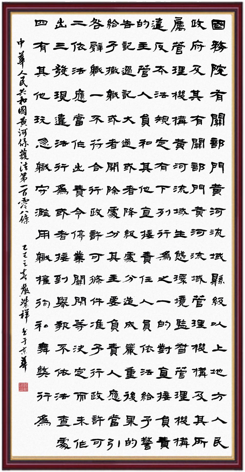黃河寧,天下平。黃河是中華民族的發(fā)源地和搖籃,保護(hù)黃河是事關(guān)中華民族偉大復(fù)興的千秋大計(jì)?!吨腥A人民共和國(guó)黃河保護(hù)法》為推進(jìn)水資源節(jié)約集約利用、保護(hù)傳承弘揚(yáng)黃河文化、推動(dòng)黃河流域生態(tài)保護(hù)和高質(zhì)量發(fā)展提供了有力法治保障。繼書(shū)寫(xiě)《中華人民共和國(guó)民法典》《中華人民共和國(guó)憲法》《中華人民共和國(guó)澳門(mén)特別行政區(qū)基本法》《中華人民共和國(guó)香港特別行政區(qū)基本法》《中華人民共和國(guó)國(guó)旗法》《中華人民共和國(guó)國(guó)徽法》《中華人民共和國(guó)國(guó)歌法》《中華人民共和國(guó)法官法》等法律法規(guī)之后,法制日?qǐng)?bào)社聯(lián)合沿黃九?。▍^(qū))司法廳、書(shū)法家協(xié)會(huì),將筆端對(duì)準(zhǔn)《中華人民共和國(guó)黃河保護(hù)法》。