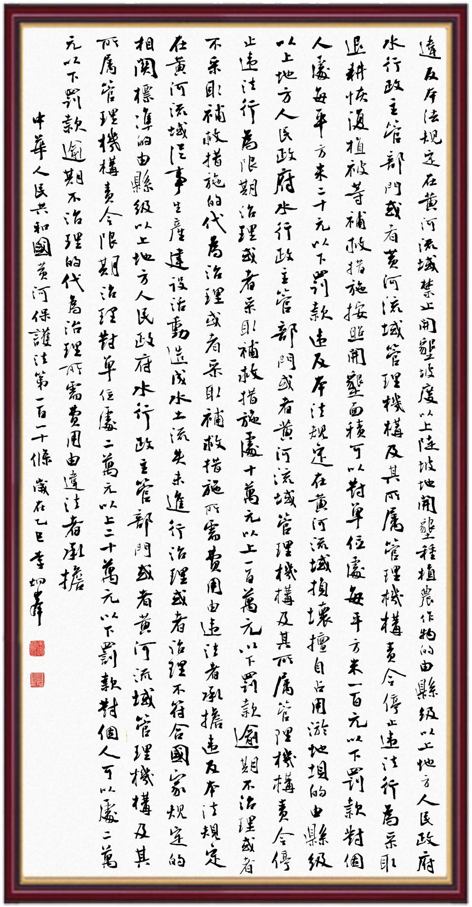 黃河寧,天下平。黃河是中華民族的發(fā)源地和搖籃,保護黃河是事關(guān)中華民族偉大復(fù)興的千秋大計。《中華人民共和國黃河保護法》為推進水資源節(jié)約集約利用、保護傳承弘揚黃河文化、推動黃河流域生態(tài)保護和高質(zhì)量發(fā)展提供了有力法治保障。繼書寫《中華人民共和國民法典》《中華人民共和國憲法》《中華人民共和國澳門特別行政區(qū)基本法》《中華人民共和國香港特別行政區(qū)基本法》《中華人民共和國國旗法》《中華人民共和國國徽法》《中華人民共和國國歌法》《中華人民共和國法官法》等法律法規(guī)之后,法制日報社聯(lián)合沿黃九?。▍^(qū))司法廳、書法家協(xié)會,將筆端對準(zhǔn)《中華人民共和國黃河保護法》。