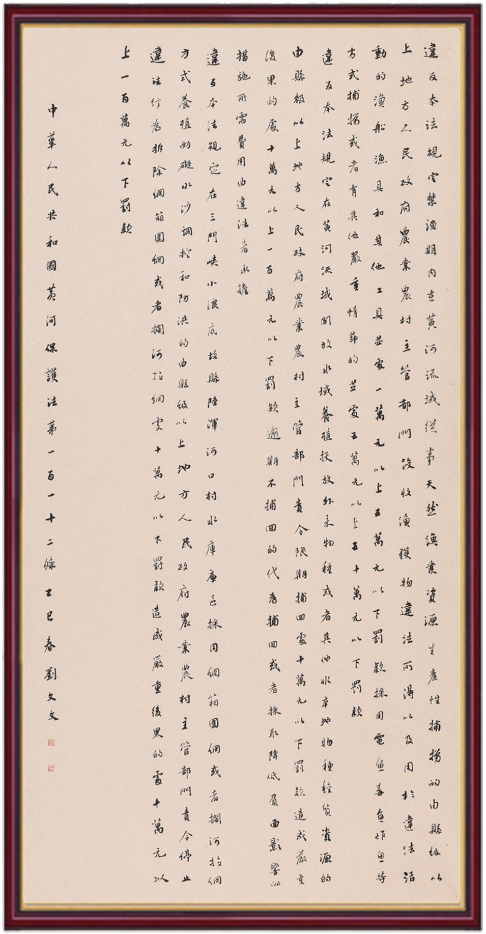 黃河寧,天下平。黃河是中華民族的發(fā)源地和搖籃,保護黃河是事關(guān)中華民族偉大復(fù)興的千秋大計?!吨腥A人民共和國黃河保護法》為推進水資源節(jié)約集約利用、保護傳承弘揚黃河文化、推動黃河流域生態(tài)保護和高質(zhì)量發(fā)展提供了有力法治保障。繼書寫《中華人民共和國民法典》《中華人民共和國憲法》《中華人民共和國澳門特別行政區(qū)基本法》《中華人民共和國香港特別行政區(qū)基本法》《中華人民共和國國旗法》《中華人民共和國國徽法》《中華人民共和國國歌法》《中華人民共和國法官法》等法律法規(guī)之后,法制日報社聯(lián)合沿黃九?。▍^(qū))司法廳、書法家協(xié)會,將筆端對準(zhǔn)《中華人民共和國黃河保護法》。