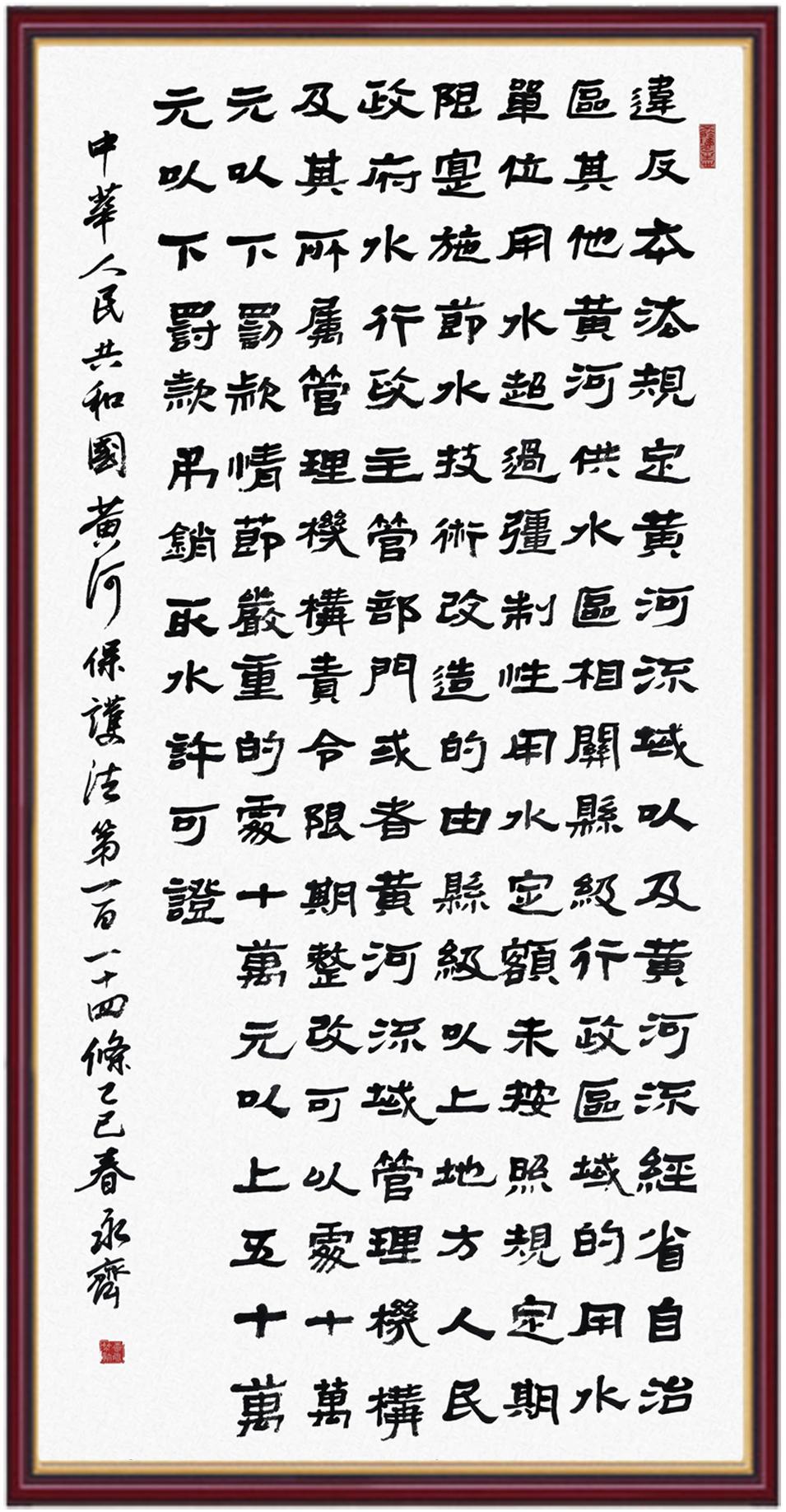 黃河寧,天下平。黃河是中華民族的發(fā)源地和搖籃,保護(hù)黃河是事關(guān)中華民族偉大復(fù)興的千秋大計(jì)。《中華人民共和國(guó)黃河保護(hù)法》為推進(jìn)水資源節(jié)約集約利用、保護(hù)傳承弘揚(yáng)黃河文化、推動(dòng)黃河流域生態(tài)保護(hù)和高質(zhì)量發(fā)展提供了有力法治保障。繼書(shū)寫(xiě)《中華人民共和國(guó)民法典》《中華人民共和國(guó)憲法》《中華人民共和國(guó)澳門(mén)特別行政區(qū)基本法》《中華人民共和國(guó)香港特別行政區(qū)基本法》《中華人民共和國(guó)國(guó)旗法》《中華人民共和國(guó)國(guó)徽法》《中華人民共和國(guó)國(guó)歌法》《中華人民共和國(guó)法官法》等法律法規(guī)之后,法制日?qǐng)?bào)社聯(lián)合沿黃九?。▍^(qū))司法廳、書(shū)法家協(xié)會(huì),將筆端對(duì)準(zhǔn)《中華人民共和國(guó)黃河保護(hù)法》。