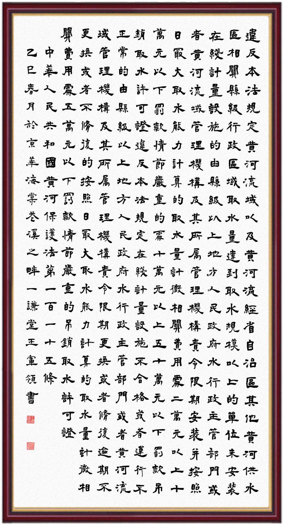 黃河寧,天下平。黃河是中華民族的發(fā)源地和搖籃,保護(hù)黃河是事關(guān)中華民族偉大復(fù)興的千秋大計?!吨腥A人民共和國黃河保護(hù)法》為推進(jìn)水資源節(jié)約集約利用、保護(hù)傳承弘揚(yáng)黃河文化、推動黃河流域生態(tài)保護(hù)和高質(zhì)量發(fā)展提供了有力法治保障。繼書寫《中華人民共和國民法典》《中華人民共和國憲法》《中華人民共和國澳門特別行政區(qū)基本法》《中華人民共和國香港特別行政區(qū)基本法》《中華人民共和國國旗法》《中華人民共和國國徽法》《中華人民共和國國歌法》《中華人民共和國法官法》等法律法規(guī)之后,法制日報社聯(lián)合沿黃九省(區(qū))司法廳、書法家協(xié)會,將筆端對準(zhǔn)《中華人民共和國黃河保護(hù)法》。