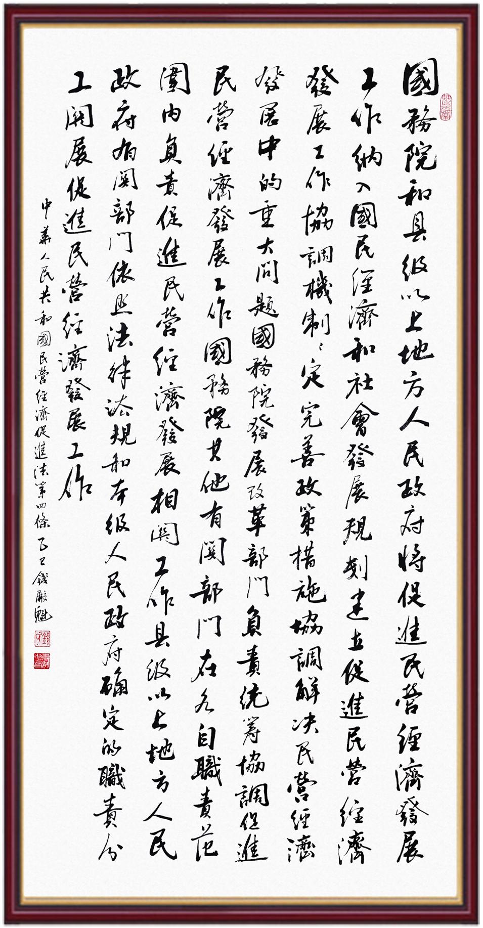 《中華人民共和國(guó)民營(yíng)經(jīng)濟(jì)促進(jìn)法》自今年5月20日起施行。作為我國(guó)首部專(zhuān)門(mén)關(guān)于民營(yíng)經(jīng)濟(jì)發(fā)展的基礎(chǔ)性法律,民營(yíng)經(jīng)濟(jì)促進(jìn)法將支持和保障民營(yíng)經(jīng)濟(jì)發(fā)展的法律制度融入中國(guó)特色社會(huì)主義法律體系,具有重大的法治意義,為促進(jìn)民營(yíng)經(jīng)濟(jì)持續(xù)、健康、高質(zhì)量發(fā)展提供了堅(jiān)實(shí)的法治保障。為更好地學(xué)習(xí)、宣傳、貫徹這部法律,法治日?qǐng)?bào)社聯(lián)合司法部普法與依法治理局,開(kāi)展“‘書(shū)·法’系列活動(dòng)之書(shū)寫(xiě)《中華人民共和國(guó)民營(yíng)經(jīng)濟(jì)促進(jìn)法》”活動(dòng)。