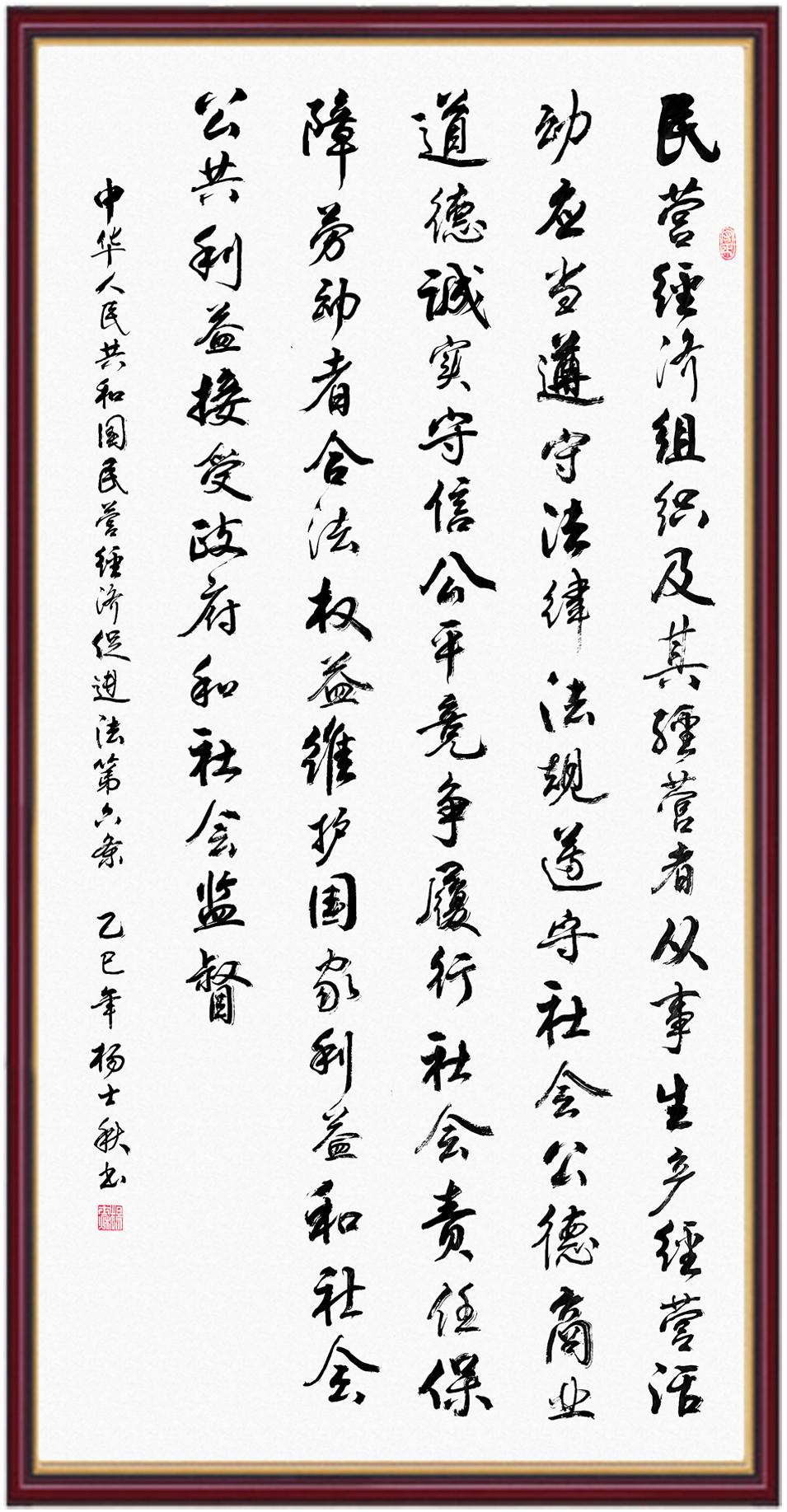 《中華人民共和國民營(yíng)經(jīng)濟(jì)促進(jìn)法》自今年5月20日起施行。作為我國首部專門關(guān)于民營(yíng)經(jīng)濟(jì)發(fā)展的基礎(chǔ)性法律,民營(yíng)經(jīng)濟(jì)促進(jìn)法將支持和保障民營(yíng)經(jīng)濟(jì)發(fā)展的法律制度融入中國特色社會(huì)主義法律體系,具有重大的法治意義,為促進(jìn)民營(yíng)經(jīng)濟(jì)持續(xù)、健康、高質(zhì)量發(fā)展提供了堅(jiān)實(shí)的法治保障。為更好地學(xué)習(xí)、宣傳、貫徹這部法律,法治日?qǐng)?bào)社聯(lián)合司法部普法與依法治理局,開展“‘書·法’系列活動(dòng)之書寫《中華人民共和國民營(yíng)經(jīng)濟(jì)促進(jìn)法》”活動(dòng)。