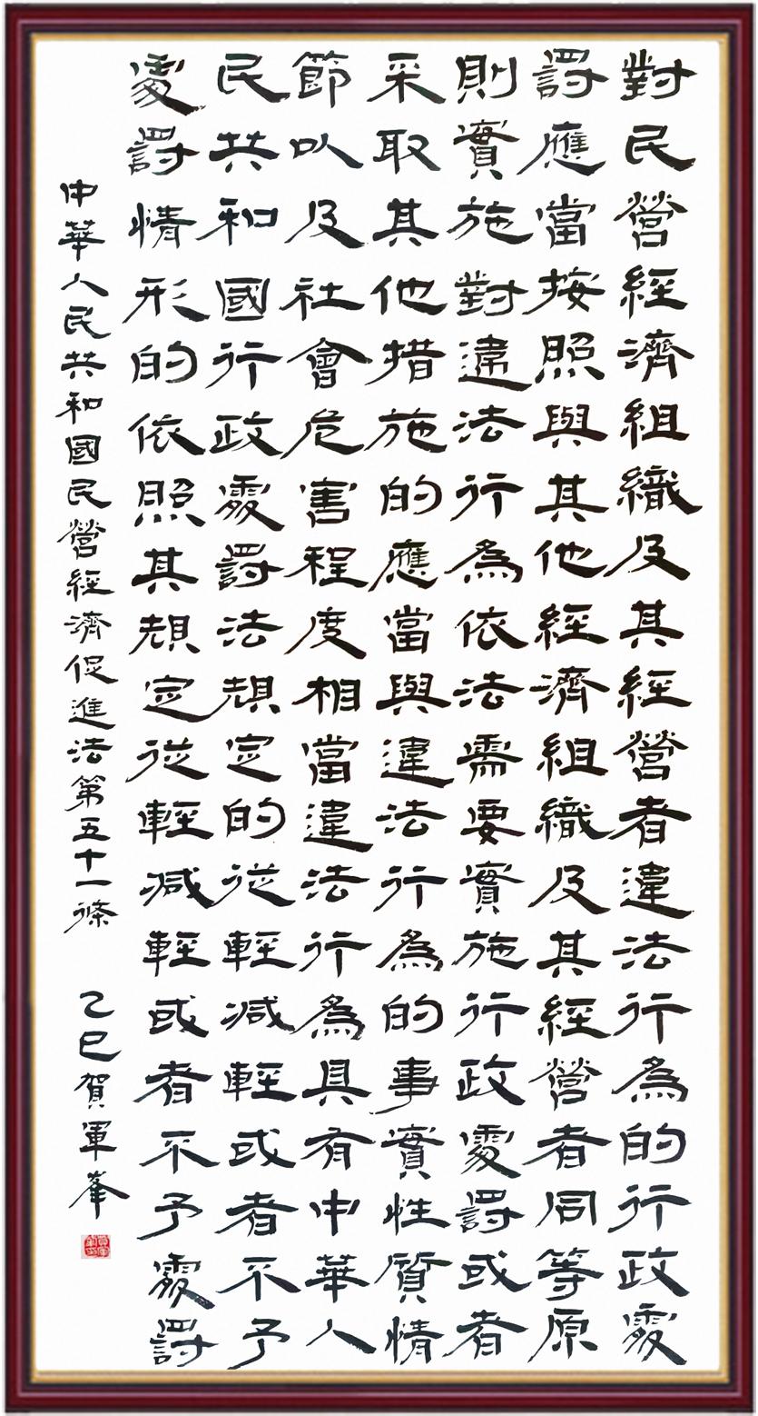 《中華人民共和國民營經(jīng)濟(jì)促進(jìn)法》自今年5月20日起施行。作為我國首部專門關(guān)于民營經(jīng)濟(jì)發(fā)展的基礎(chǔ)性法律,民營經(jīng)濟(jì)促進(jìn)法將支持和保障民營經(jīng)濟(jì)發(fā)展的法律制度融入中國特色社會主義法律體系,具有重大的法治意義,為促進(jìn)民營經(jīng)濟(jì)持續(xù)、健康、高質(zhì)量發(fā)展提供了堅實(shí)的法治保障。為更好地學(xué)習(xí)、宣傳、貫徹這部法律,法治日報社聯(lián)合司法部普法與依法治理局,開展“‘書·法’系列活動之書寫《中華人民共和國民營經(jīng)濟(jì)促進(jìn)法》”活動。