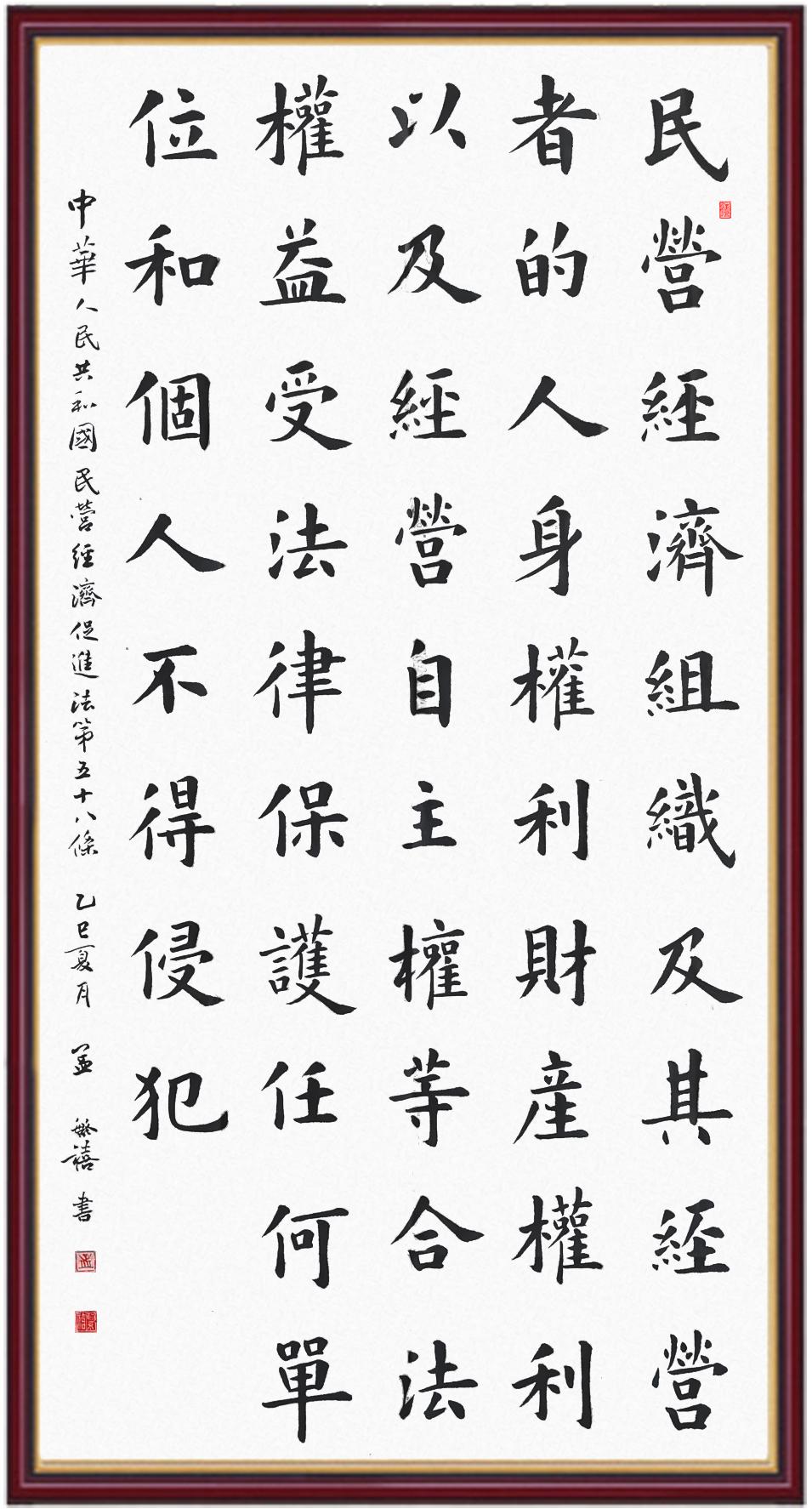 《中華人民共和國民營經(jīng)濟(jì)促進(jìn)法》自今年5月20日起施行。作為我國首部專門關(guān)于民營經(jīng)濟(jì)發(fā)展的基礎(chǔ)性法律,民營經(jīng)濟(jì)促進(jìn)法將支持和保障民營經(jīng)濟(jì)發(fā)展的法律制度融入中國特色社會主義法律體系,具有重大的法治意義,為促進(jìn)民營經(jīng)濟(jì)持續(xù)、健康、高質(zhì)量發(fā)展提供了堅(jiān)實(shí)的法治保障。為更好地學(xué)習(xí)、宣傳、貫徹這部法律,法治日報(bào)社聯(lián)合司法部普法與依法治理局,開展“‘書·法’系列活動(dòng)之書寫《中華人民共和國民營經(jīng)濟(jì)促進(jìn)法》”活動(dòng)。