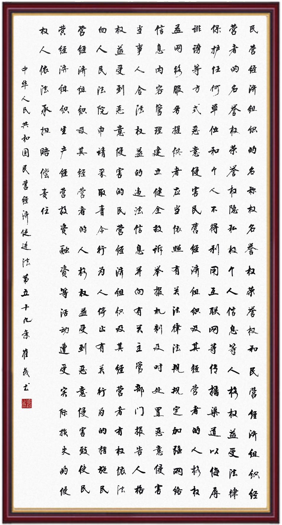 《中華人民共和國民營經(jīng)濟(jì)促進(jìn)法》自今年5月20日起施行。作為我國首部專門關(guān)于民營經(jīng)濟(jì)發(fā)展的基礎(chǔ)性法律,民營經(jīng)濟(jì)促進(jìn)法將支持和保障民營經(jīng)濟(jì)發(fā)展的法律制度融入中國特色社會主義法律體系,具有重大的法治意義,為促進(jìn)民營經(jīng)濟(jì)持續(xù)、健康、高質(zhì)量發(fā)展提供了堅(jiān)實(shí)的法治保障。為更好地學(xué)習(xí)、宣傳、貫徹這部法律,法治日報社聯(lián)合司法部普法與依法治理局,開展“‘書·法’系列活動之書寫《中華人民共和國民營經(jīng)濟(jì)促進(jìn)法》”活動。