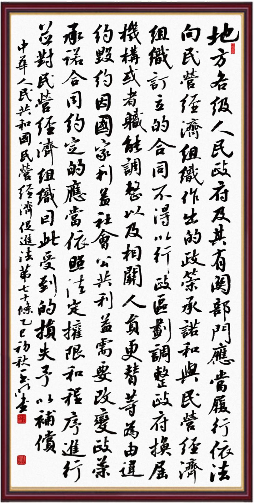 《中華人民共和國(guó)民營(yíng)經(jīng)濟(jì)促進(jìn)法》自今年5月20日起施行。作為我國(guó)首部專門關(guān)于民營(yíng)經(jīng)濟(jì)發(fā)展的基礎(chǔ)性法律,民營(yíng)經(jīng)濟(jì)促進(jìn)法將支持和保障民營(yíng)經(jīng)濟(jì)發(fā)展的法律制度融入中國(guó)特色社會(huì)主義法律體系,具有重大的法治意義,為促進(jìn)民營(yíng)經(jīng)濟(jì)持續(xù)、健康、高質(zhì)量發(fā)展提供了堅(jiān)實(shí)的法治保障。為更好地學(xué)習(xí)、宣傳、貫徹這部法律,法治日?qǐng)?bào)社聯(lián)合司法部普法與依法治理局,開展“‘書·法’系列活動(dòng)之書寫《中華人民共和國(guó)民營(yíng)經(jīng)濟(jì)促進(jìn)法》”活動(dòng)。