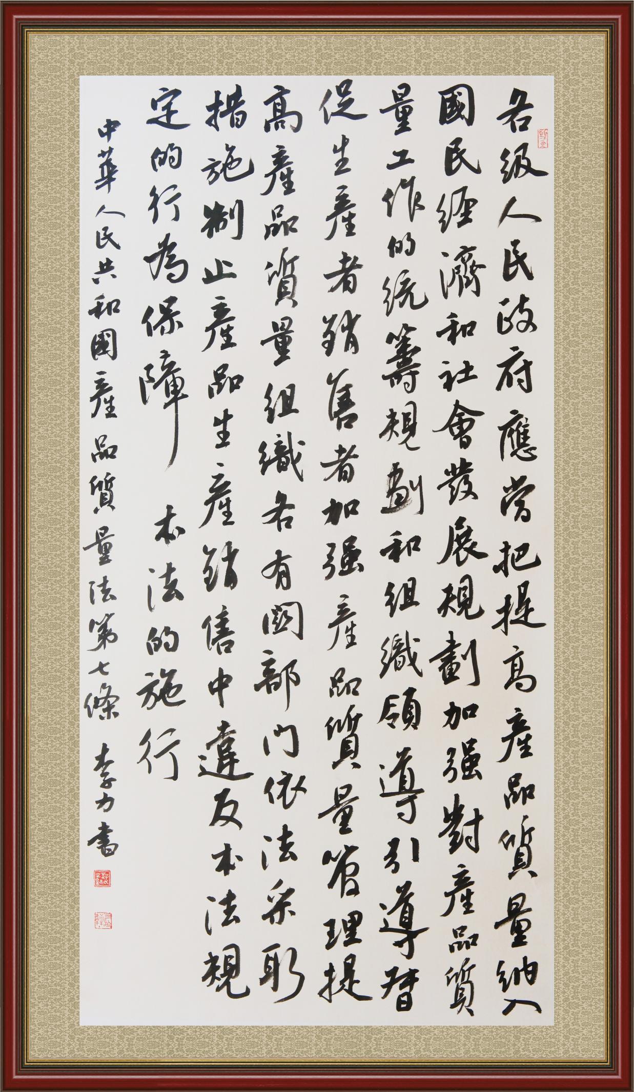 《中華人民共和國產(chǎn)品質(zhì)量法》自1993年9月1日起開始施行,先后進行三次修正。作為產(chǎn)品質(zhì)量領(lǐng)域的基本法律,產(chǎn)品質(zhì)量法對規(guī)范產(chǎn)品質(zhì)量管理、維護消費者合法權(quán)益、促進經(jīng)濟社會發(fā)展具有重要意義。為更好地學(xué)習(xí)、宣傳、貫徹這部法律,在國家市場監(jiān)督管理總局法規(guī)司的支持下,法治日報社開展了“‘書·法’系列活動之書寫《中華人民共和國產(chǎn)品質(zhì)量法》”活動。