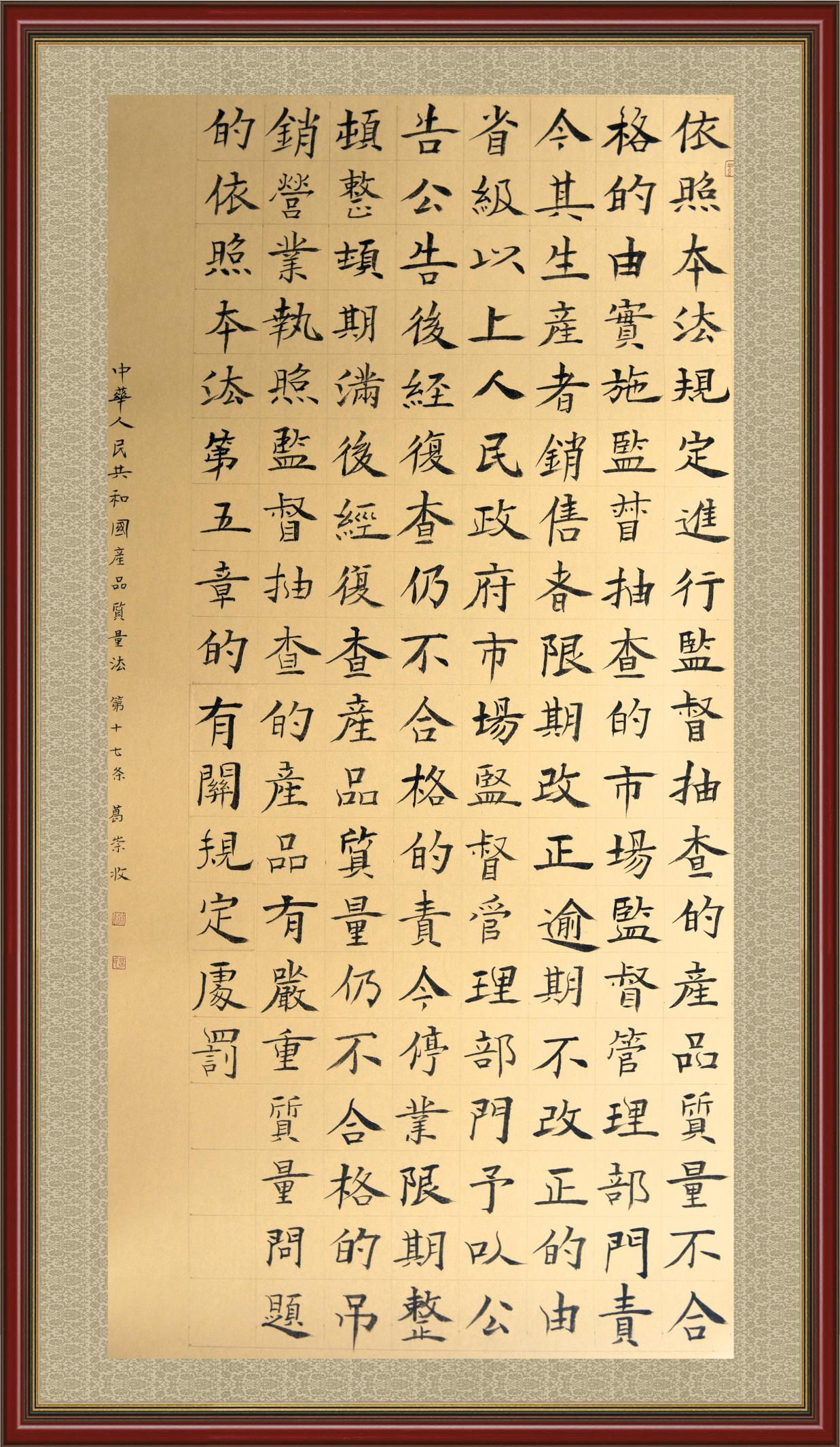 《中華人民共和國產(chǎn)品質(zhì)量法》自1993年9月1日起開始施行,先后進(jìn)行三次修正。作為產(chǎn)品質(zhì)量領(lǐng)域的基本法律,產(chǎn)品質(zhì)量法對規(guī)范產(chǎn)品質(zhì)量管理、維護(hù)消費(fèi)者合法權(quán)益、促進(jìn)經(jīng)濟(jì)社會發(fā)展具有重要意義。為更好地學(xué)習(xí)、宣傳、貫徹這部法律,在國家市場監(jiān)督管理總局法規(guī)司的支持下,法治日報(bào)社開展了“‘書·法’系列活動之書寫《中華人民共和國產(chǎn)品質(zhì)量法》”活動。