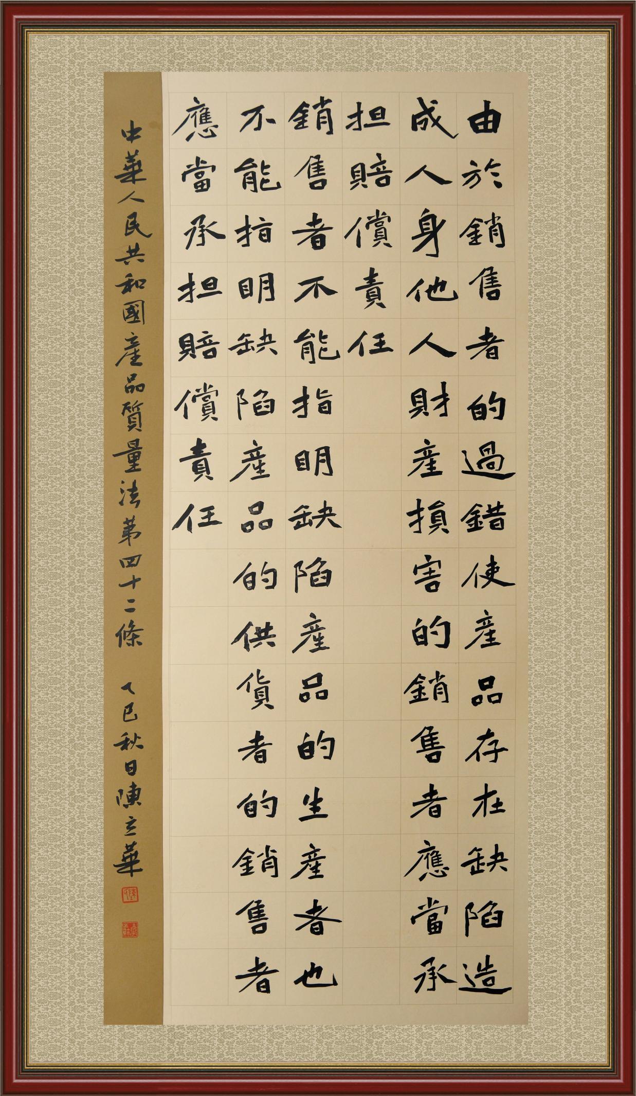 《中華人民共和國產(chǎn)品質(zhì)量法》自1993年9月1日起開始施行,先后進行三次修正。作為產(chǎn)品質(zhì)量領(lǐng)域的基本法律,產(chǎn)品質(zhì)量法對規(guī)范產(chǎn)品質(zhì)量管理、維護消費者合法權(quán)益、促進經(jīng)濟社會發(fā)展具有重要意義。為更好地學習、宣傳、貫徹這部法律,在國家市場監(jiān)督管理總局法規(guī)司的支持下,法治日報社開展了“‘書·法’系列活動之書寫《中華人民共和國產(chǎn)品質(zhì)量法》”活動。
