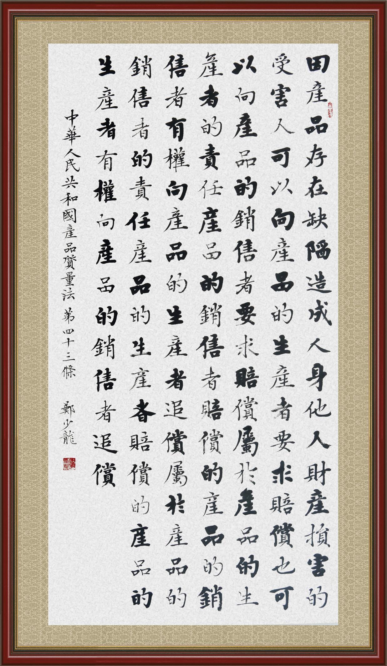 《中華人民共和國產(chǎn)品質(zhì)量法》自1993年9月1日起開始施行,先后進(jìn)行三次修正。作為產(chǎn)品質(zhì)量領(lǐng)域的基本法律,產(chǎn)品質(zhì)量法對規(guī)范產(chǎn)品質(zhì)量管理、維護(hù)消費(fèi)者合法權(quán)益、促進(jìn)經(jīng)濟(jì)社會(huì)發(fā)展具有重要意義。為更好地學(xué)習(xí)、宣傳、貫徹這部法律,在國家市場監(jiān)督管理總局法規(guī)司的支持下,法治日報(bào)社開展了“‘書·法’系列活動(dòng)之書寫《中華人民共和國產(chǎn)品質(zhì)量法》”活動(dòng)。