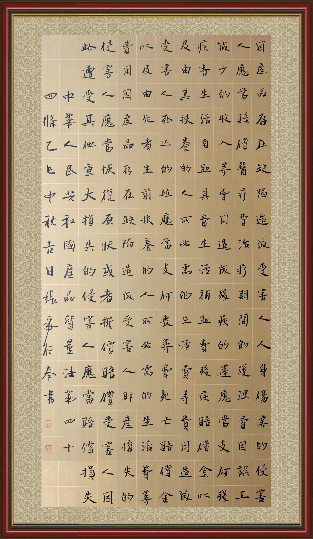 《中華人民共和國產(chǎn)品質(zhì)量法》自1993年9月1日起開始施行,先后進行三次修正。作為產(chǎn)品質(zhì)量領(lǐng)域的基本法律,產(chǎn)品質(zhì)量法對規(guī)范產(chǎn)品質(zhì)量管理、維護消費者合法權(quán)益、促進經(jīng)濟社會發(fā)展具有重要意義。為更好地學(xué)習(xí)、宣傳、貫徹這部法律,在國家市場監(jiān)督管理總局法規(guī)司的支持下,法治日報社開展了“‘書·法’系列活動之書寫《中華人民共和國產(chǎn)品質(zhì)量法》”活動。