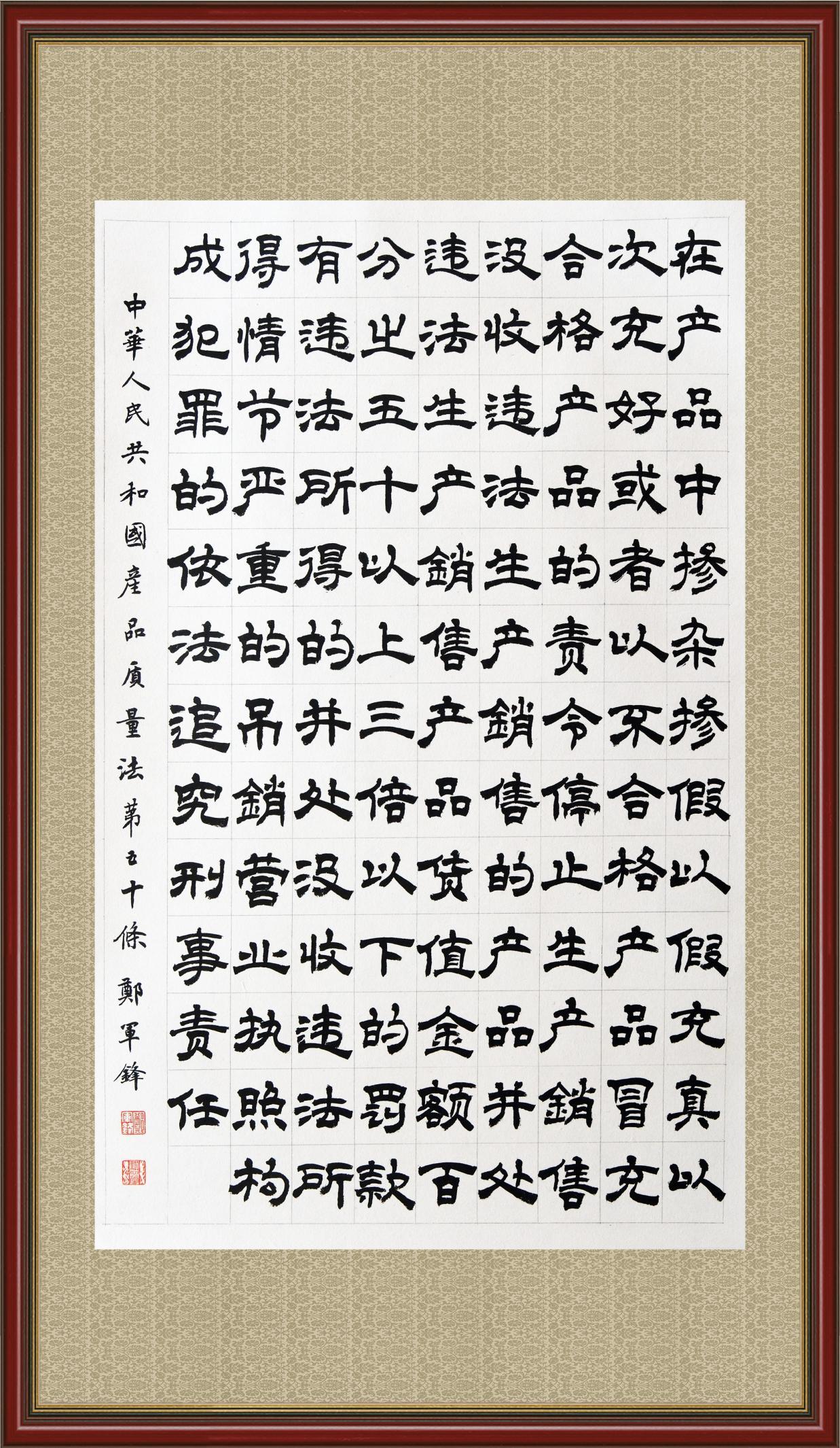 《中華人民共和國(guó)產(chǎn)品質(zhì)量法》自1993年9月1日起開(kāi)始施行,先后進(jìn)行三次修正。作為產(chǎn)品質(zhì)量領(lǐng)域的基本法律,產(chǎn)品質(zhì)量法對(duì)規(guī)范產(chǎn)品質(zhì)量管理、維護(hù)消費(fèi)者合法權(quán)益、促進(jìn)經(jīng)濟(jì)社會(huì)發(fā)展具有重要意義。為更好地學(xué)習(xí)、宣傳、貫徹這部法律,在國(guó)家市場(chǎng)監(jiān)督管理總局法規(guī)司的支持下,法治日?qǐng)?bào)社開(kāi)展了“‘書(shū)·法’系列活動(dòng)之書(shū)寫《中華人民共和國(guó)產(chǎn)品質(zhì)量法》”活動(dòng)。
