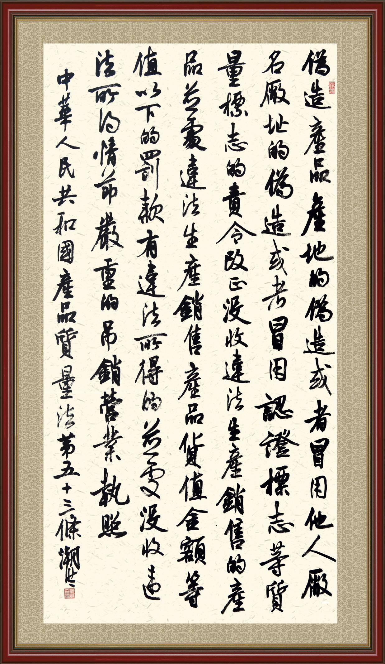 《中華人民共和國產(chǎn)品質(zhì)量法》自1993年9月1日起開始施行,先后進行三次修正。作為產(chǎn)品質(zhì)量領(lǐng)域的基本法律,產(chǎn)品質(zhì)量法對規(guī)范產(chǎn)品質(zhì)量管理、維護消費者合法權(quán)益、促進經(jīng)濟社會發(fā)展具有重要意義。為更好地學(xué)習(xí)、宣傳、貫徹這部法律,在國家市場監(jiān)督管理總局法規(guī)司的支持下,法治日報社開展了“‘書·法’系列活動之書寫《中華人民共和國產(chǎn)品質(zhì)量法》”活動。
