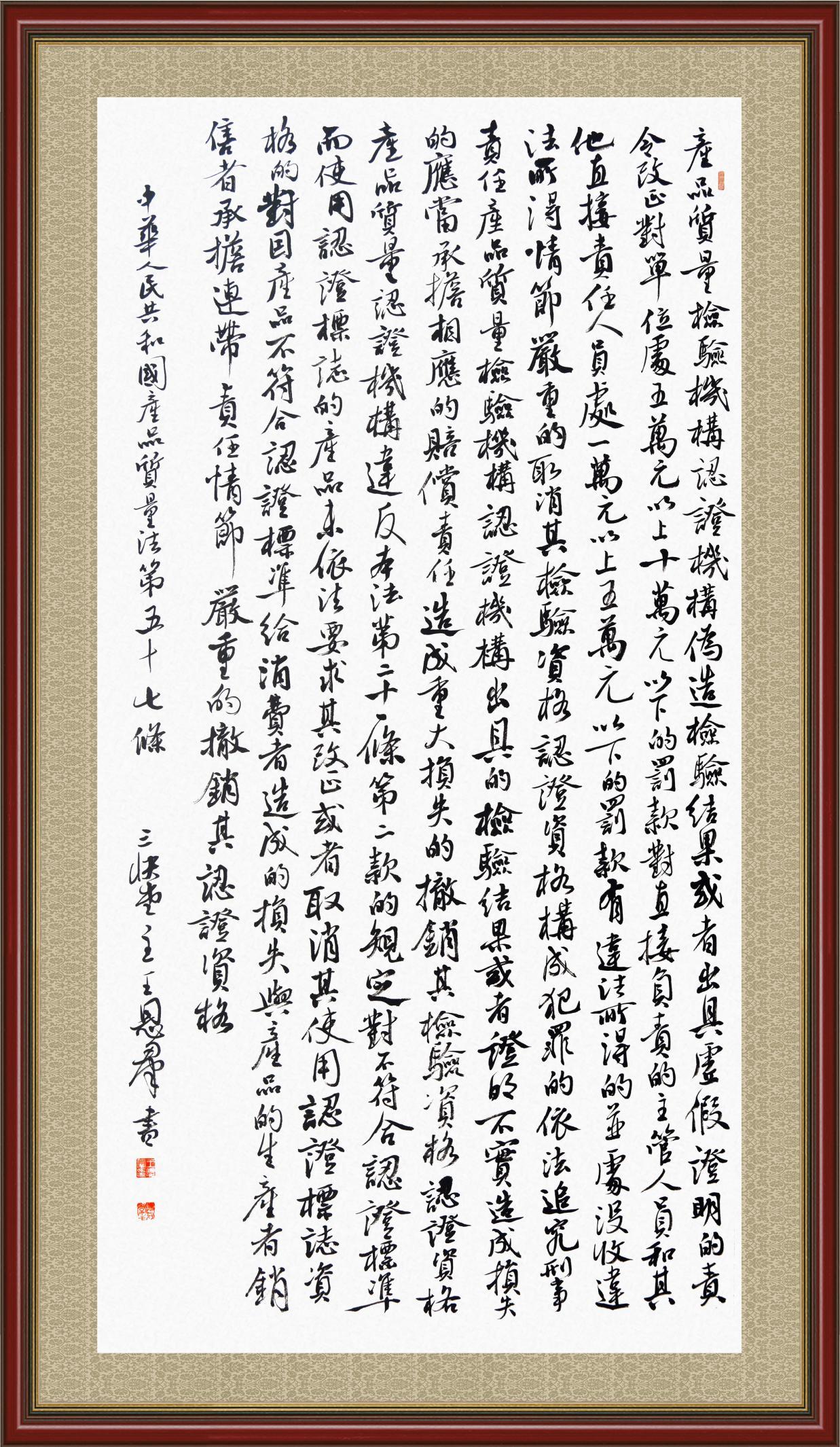 《中華人民共和國產(chǎn)品質(zhì)量法》自1993年9月1日起開始施行,先后進行三次修正。作為產(chǎn)品質(zhì)量領(lǐng)域的基本法律,產(chǎn)品質(zhì)量法對規(guī)范產(chǎn)品質(zhì)量管理、維護消費者合法權(quán)益、促進經(jīng)濟社會發(fā)展具有重要意義。為更好地學(xué)習(xí)、宣傳、貫徹這部法律,在國家市場監(jiān)督管理總局法規(guī)司的支持下,法治日報社開展了“‘書·法’系列活動之書寫《中華人民共和國產(chǎn)品質(zhì)量法》”活動。