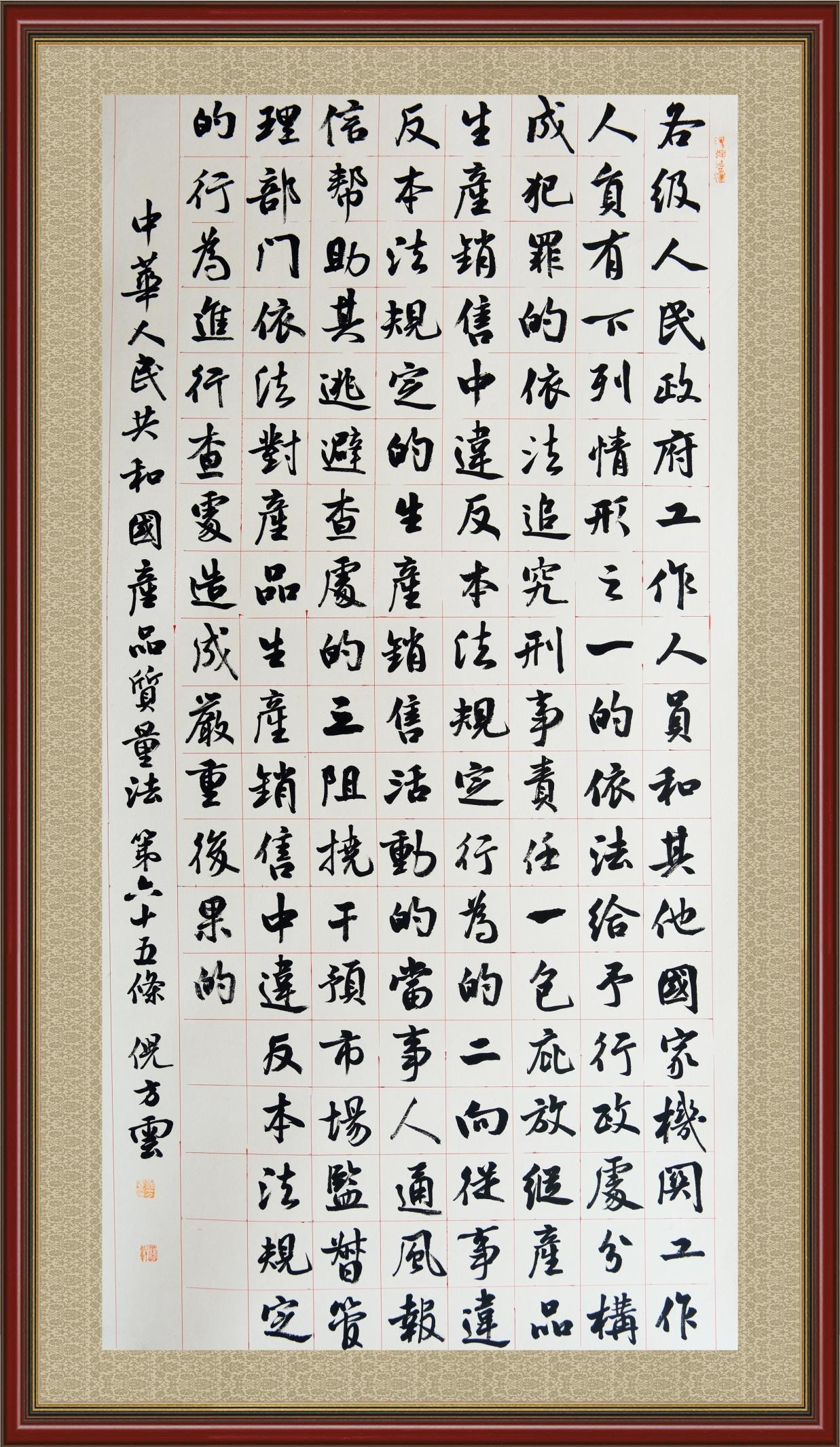 《中華人民共和國產(chǎn)品質(zhì)量法》自1993年9月1日起開始施行,先后進(jìn)行三次修正。作為產(chǎn)品質(zhì)量領(lǐng)域的基本法律,產(chǎn)品質(zhì)量法對規(guī)范產(chǎn)品質(zhì)量管理、維護(hù)消費(fèi)者合法權(quán)益、促進(jìn)經(jīng)濟(jì)社會發(fā)展具有重要意義。為更好地學(xué)習(xí)、宣傳、貫徹這部法律,在國家市場監(jiān)督管理總局法規(guī)司的支持下,法治日報(bào)社開展了“‘書·法’系列活動之書寫《中華人民共和國產(chǎn)品質(zhì)量法》”活動。