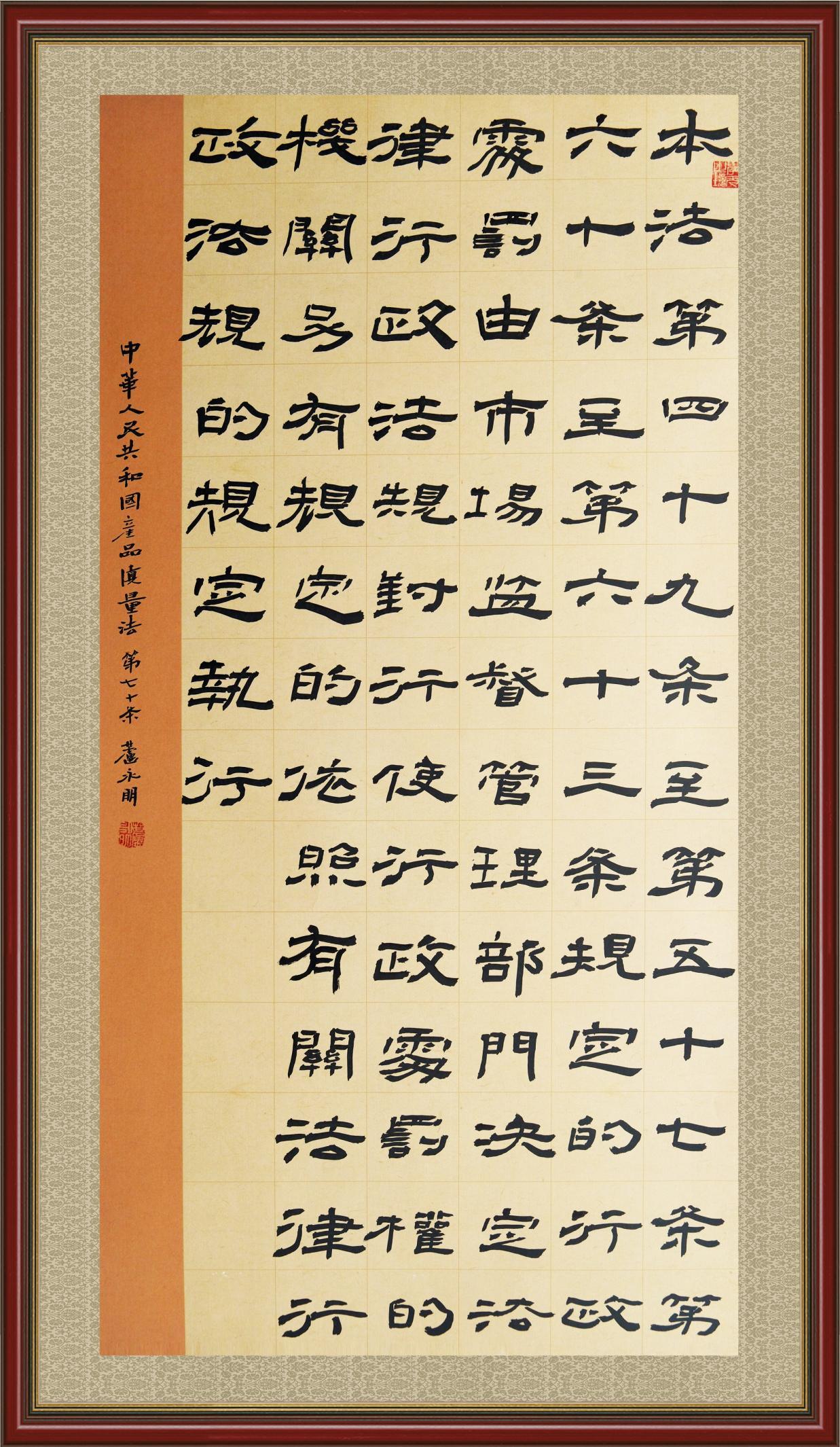 《中華人民共和國產(chǎn)品質(zhì)量法》自1993年9月1日起開始施行,先后進(jìn)行三次修正。作為產(chǎn)品質(zhì)量領(lǐng)域的基本法律,產(chǎn)品質(zhì)量法對規(guī)范產(chǎn)品質(zhì)量管理、維護(hù)消費(fèi)者合法權(quán)益、促進(jìn)經(jīng)濟(jì)社會發(fā)展具有重要意義。為更好地學(xué)習(xí)、宣傳、貫徹這部法律,在國家市場監(jiān)督管理總局法規(guī)司的支持下,法治日報社開展了“‘書·法’系列活動之書寫《中華人民共和國產(chǎn)品質(zhì)量法》”活動。